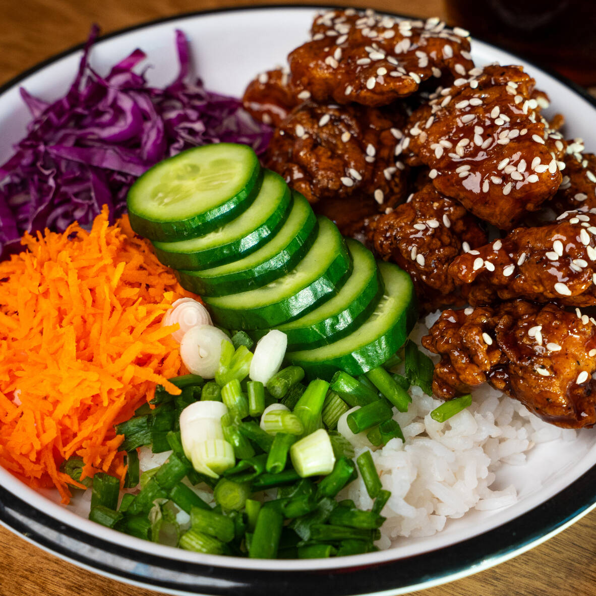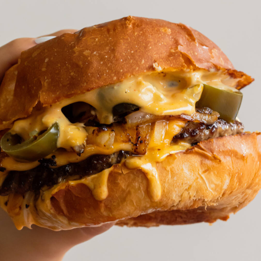 Hamburguesa de pollo frito picante, queso cheddar, pepinillos y aderezo sweet mayo. Acompañado de papas fritas.