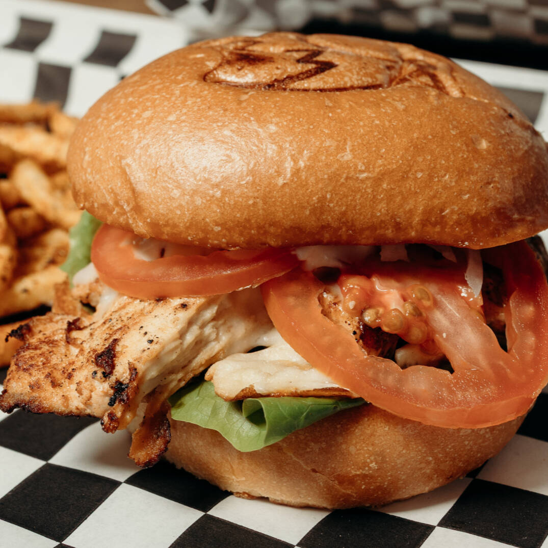 Hamburguesa de pollo frito, queso cheddar, lechuga, tomate y spicy mayo. Acompañado de papas fritas.