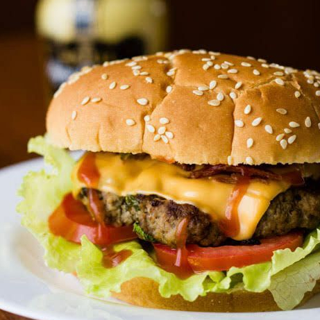 Pan, carne de res,cebolla caramelizada,queso,pepinillos, tomate, cebolla, lechuga champiñones,pepinillos,aderezo de la casa