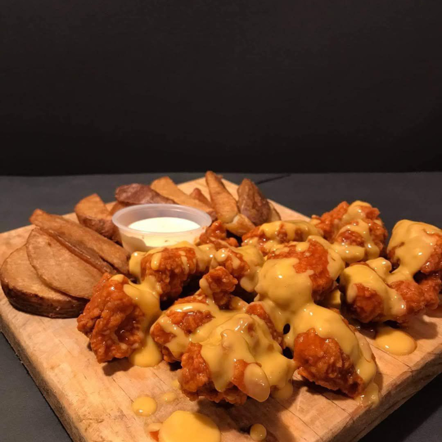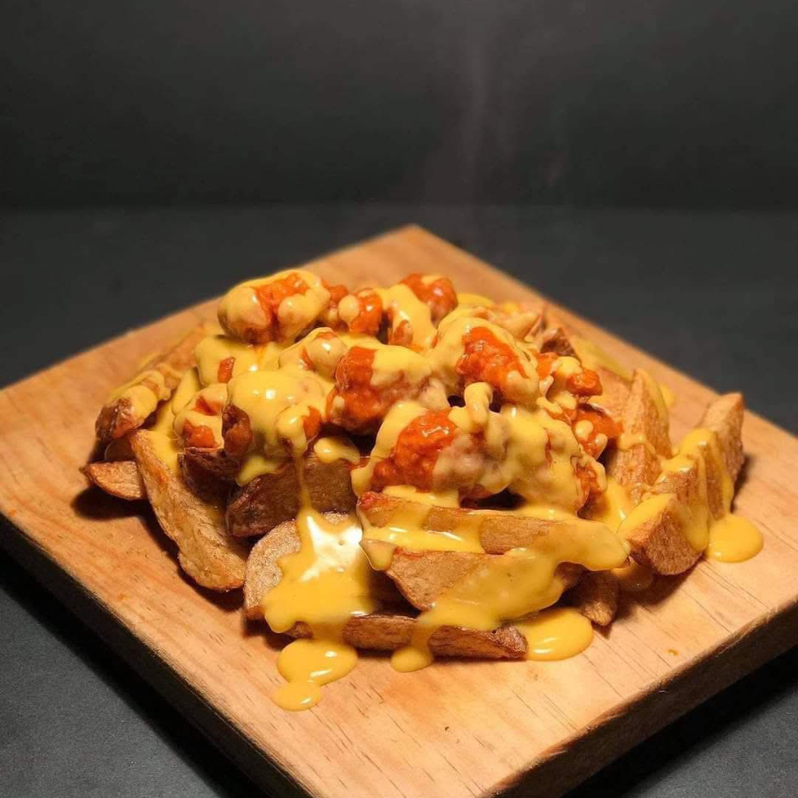 Cama de papas fritas con boneless y queso amarillo encima