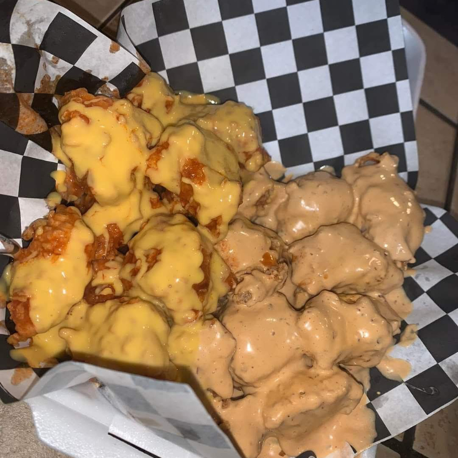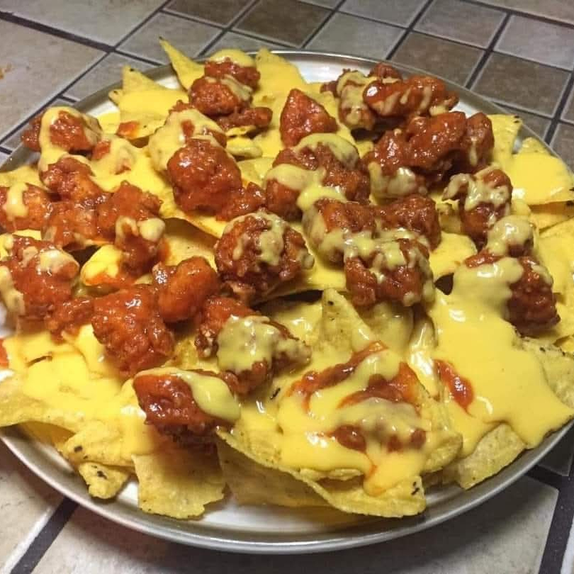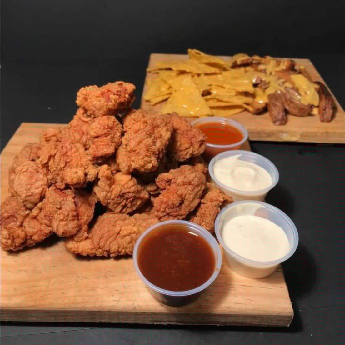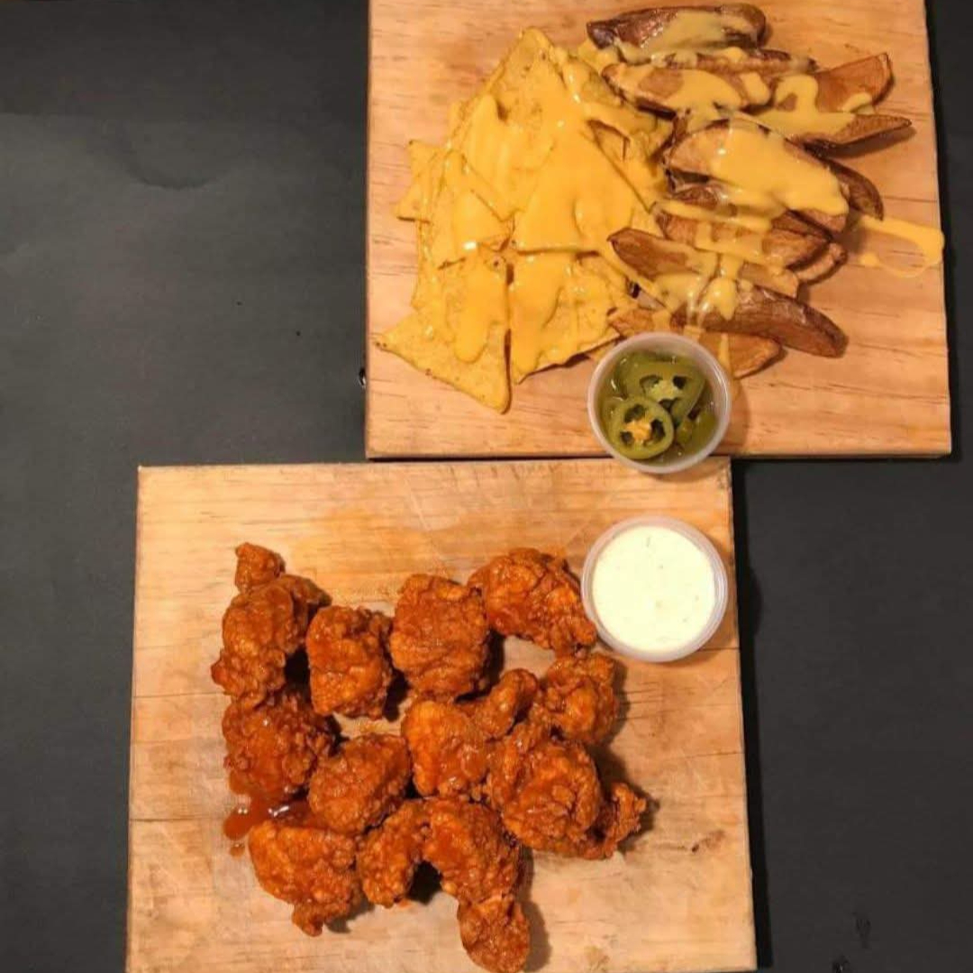 10 piezas de boneless 1/2 orden de nachos 1/2 de papas queso y aderezo