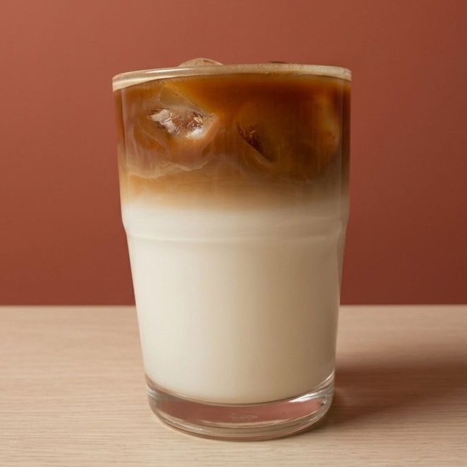 Espresso con leche fría sobre hielo. Refrescante y equilibrado.