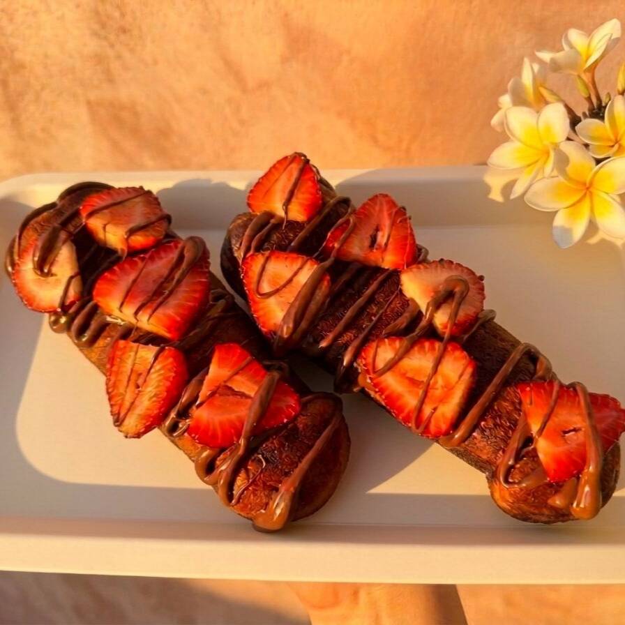 (3 piezas) Waffle dorado y crujiente con una forma divertida y original. Suave por dentro y servido con deliciosos toppings dulces que lo convierten en un postre único y lleno de picardía.