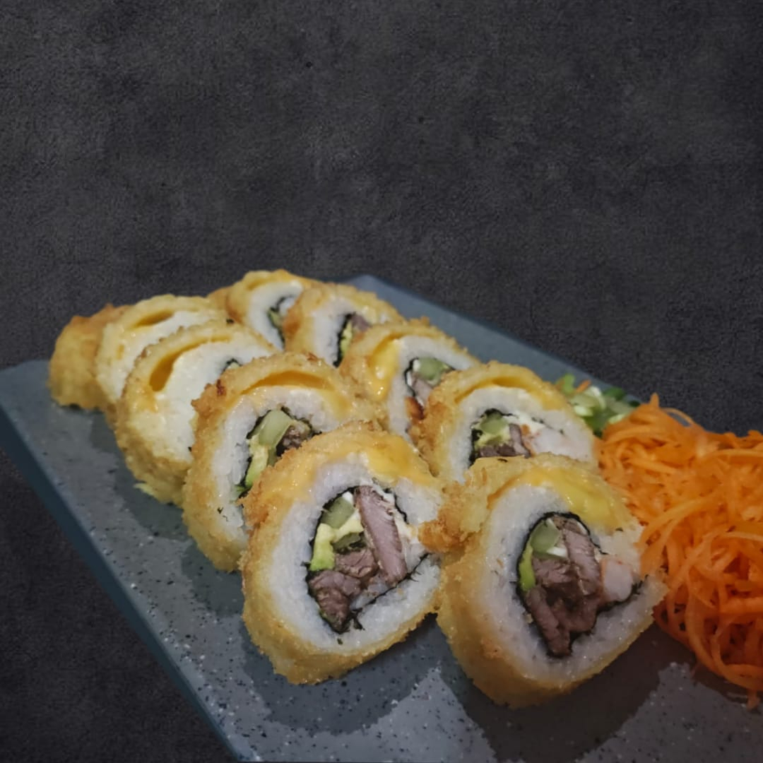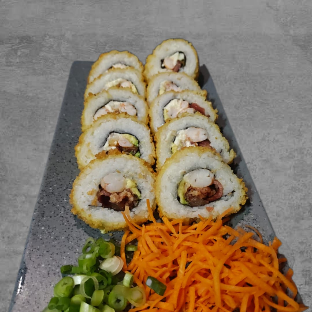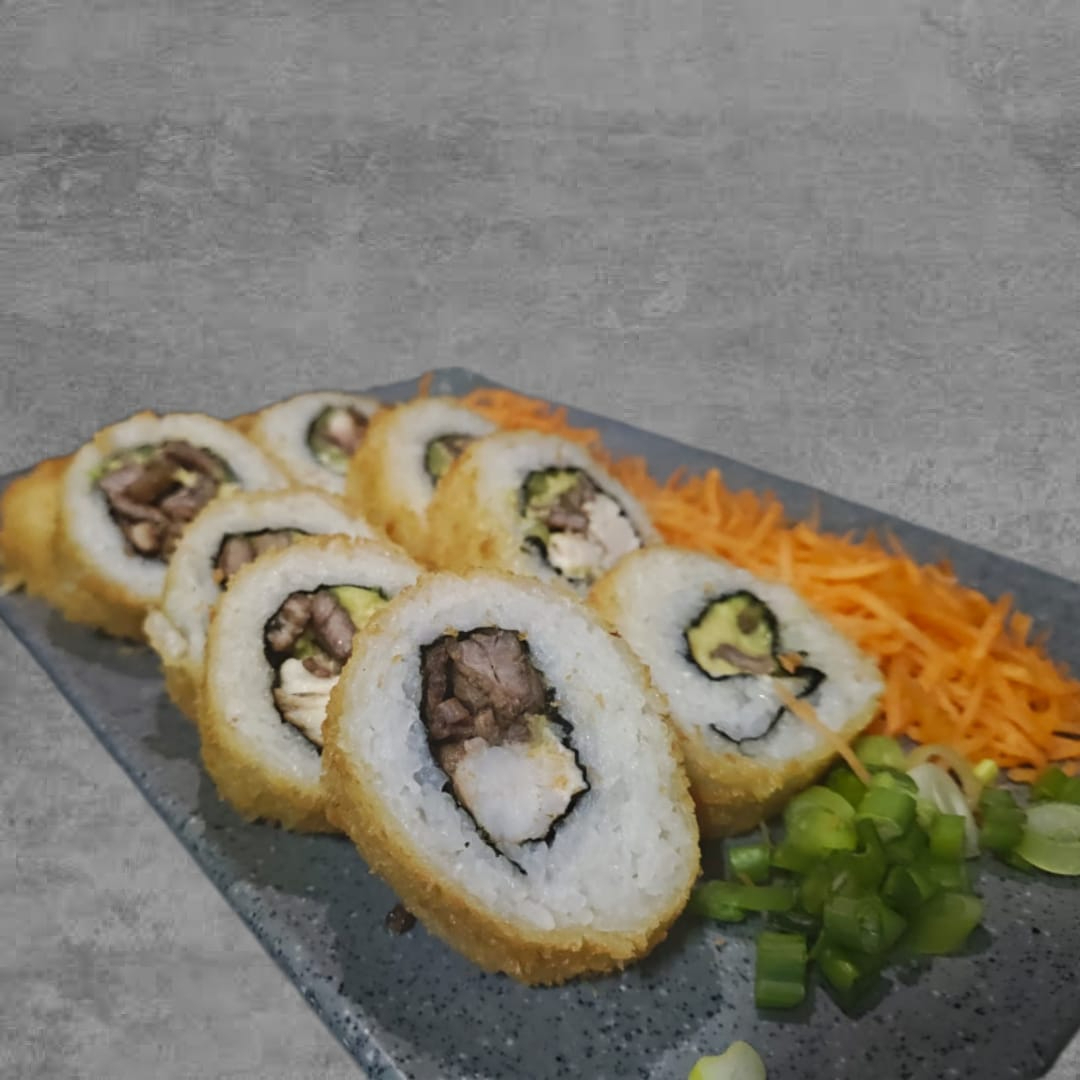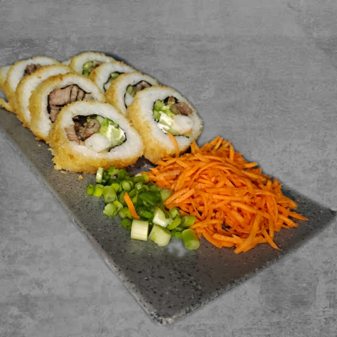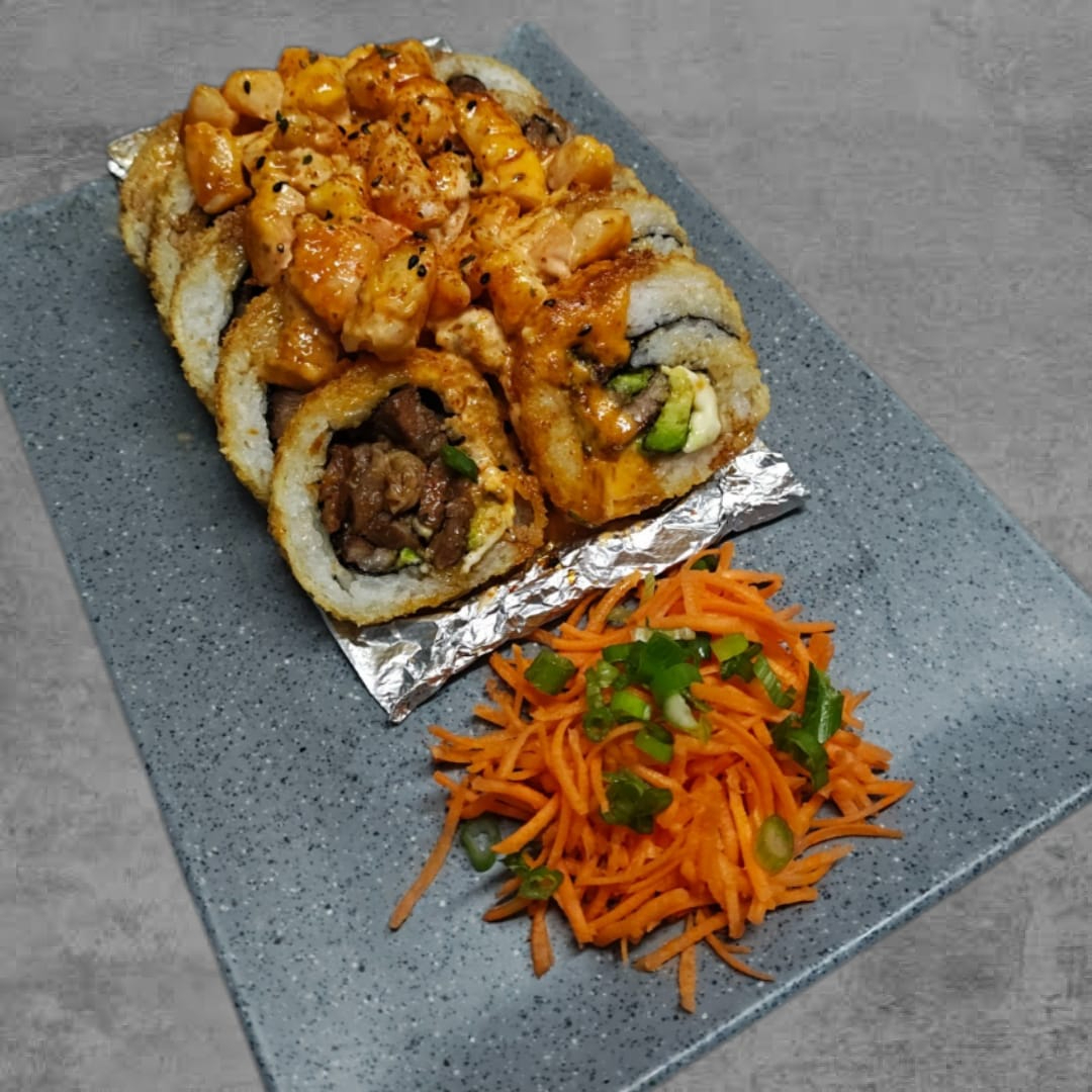 Alga, philadelphia, aguacate, pollo y surimi por dentro con topping de philadelphia, res frita, sriracha, cebollín y salsa de anguila
