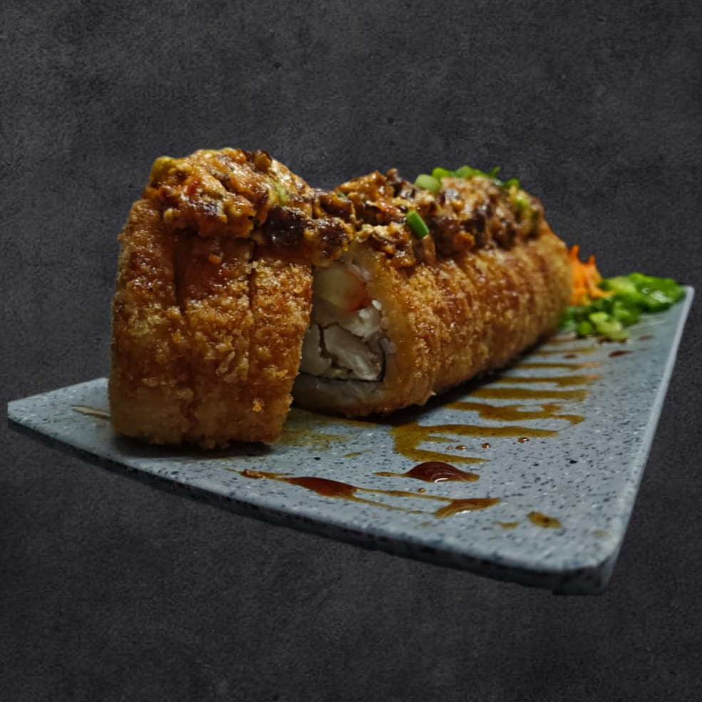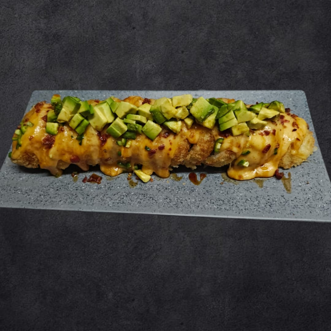 Alga, philadelphia, aguacate, camarón, res, pollo y tocino por dentro forrado en 3 quesos con topping de queso chihuahua, trozos de camarón, tocino, mayonesa, sriracha y chipotle