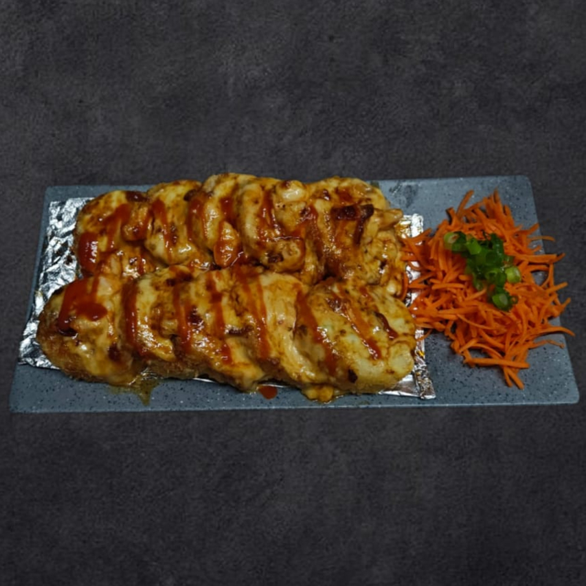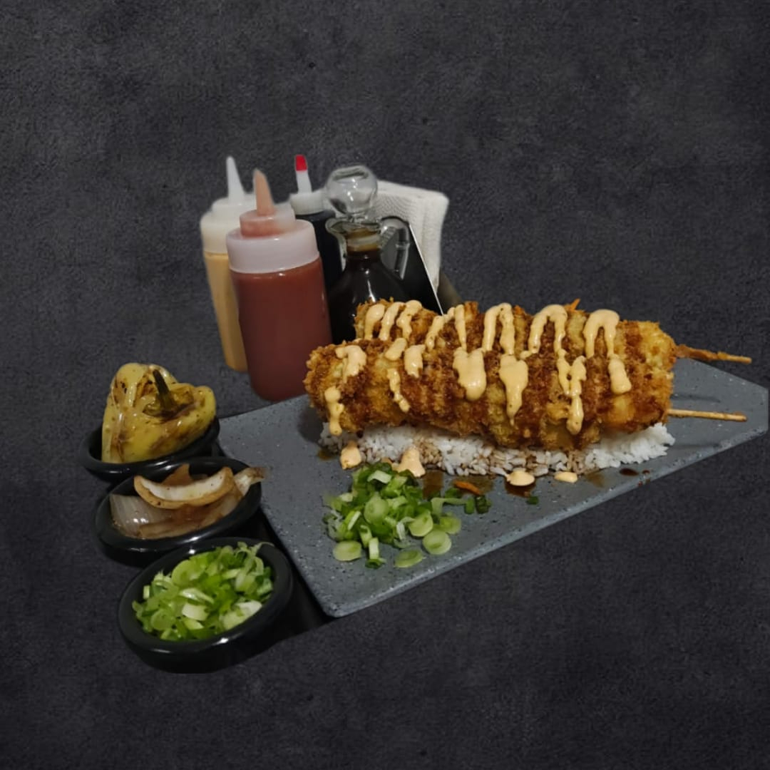 2 brochetas de camarón, pollo y queso chihuahua, montados sobre una cama de arroz bañados en salsa de anguila y aderezo de chipotle
