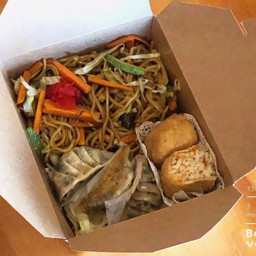 Yakisoba de verduras, inarizushi y gyozas de vegetales