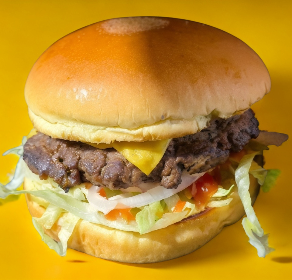 Carne 100% res , queso, tomate, cebolla, lechuga, ketchup y aderezo de la casa