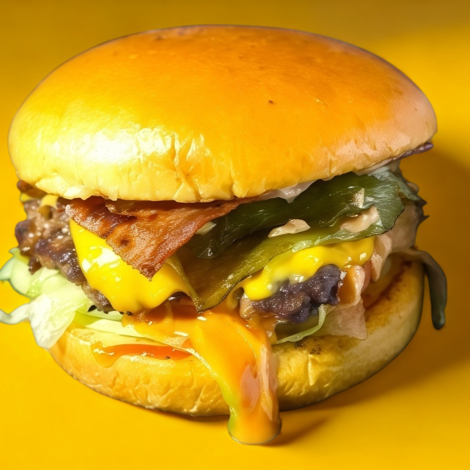 Carne 100% res , queso, chile california, tocino, tomate, cebolla, lechuga, ketchup, chipotle y aderezo de la casa