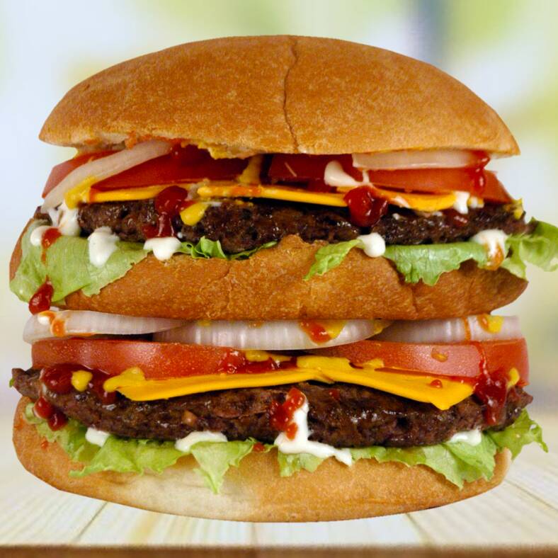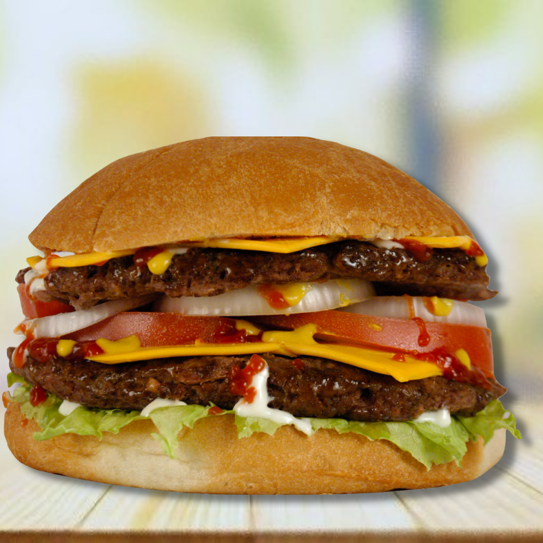Hamburguesa gigante, doble carne, doble queso, lechuga, tomate, cebolla, mayonesa, catsup, mostaza, incluye papas fritas