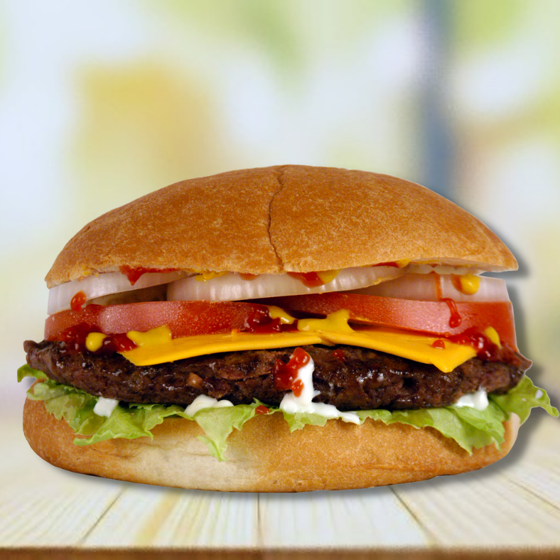 Hamburguesa Sencilla Grande, carne, queso, lechuga, tomate, cebolla, mayonesa, catsup, mostaza, incluye papas fritas