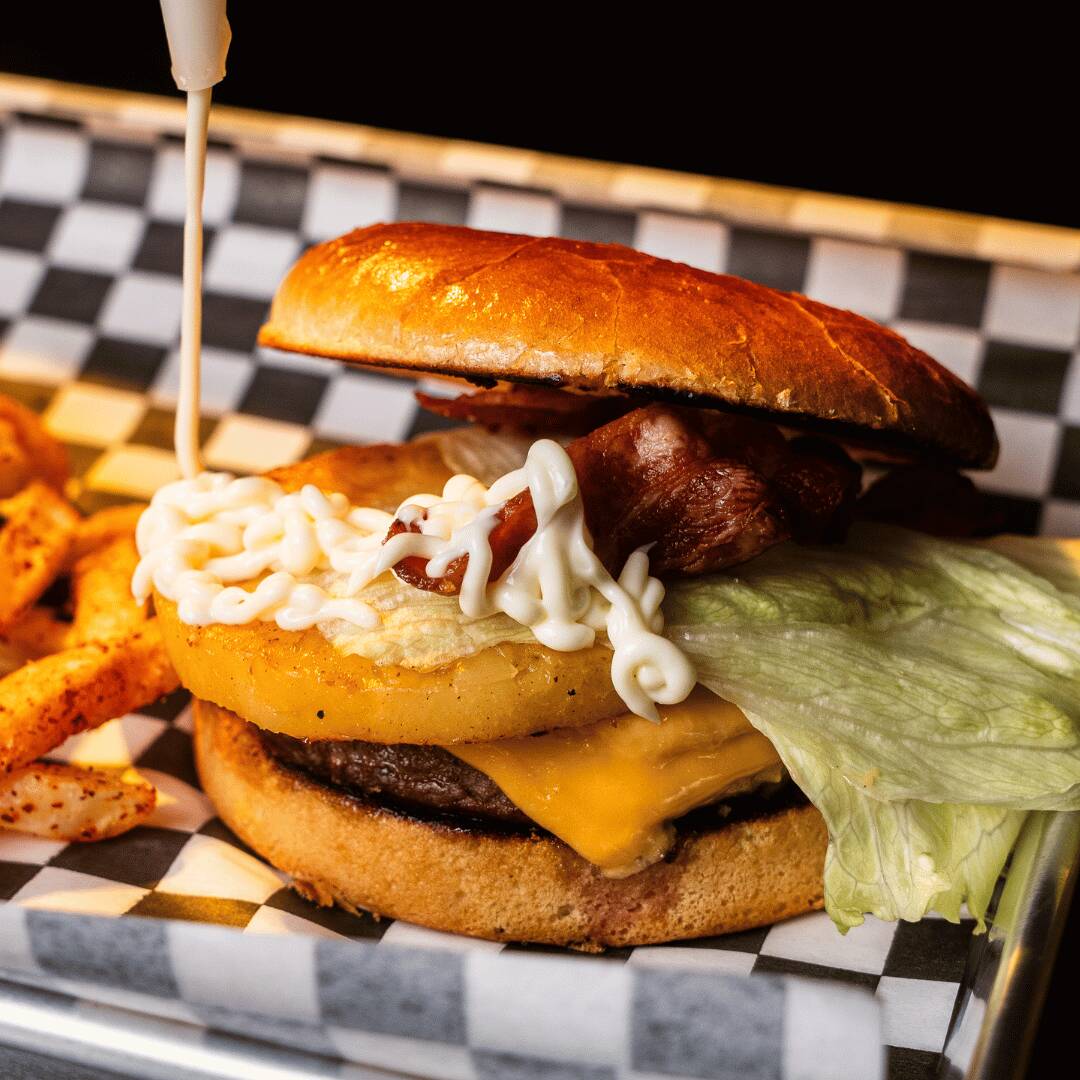 Pan brioche, Carne Sirloin, Queso, Piña Asada, Lechuga y Tocino + Papas Cajun