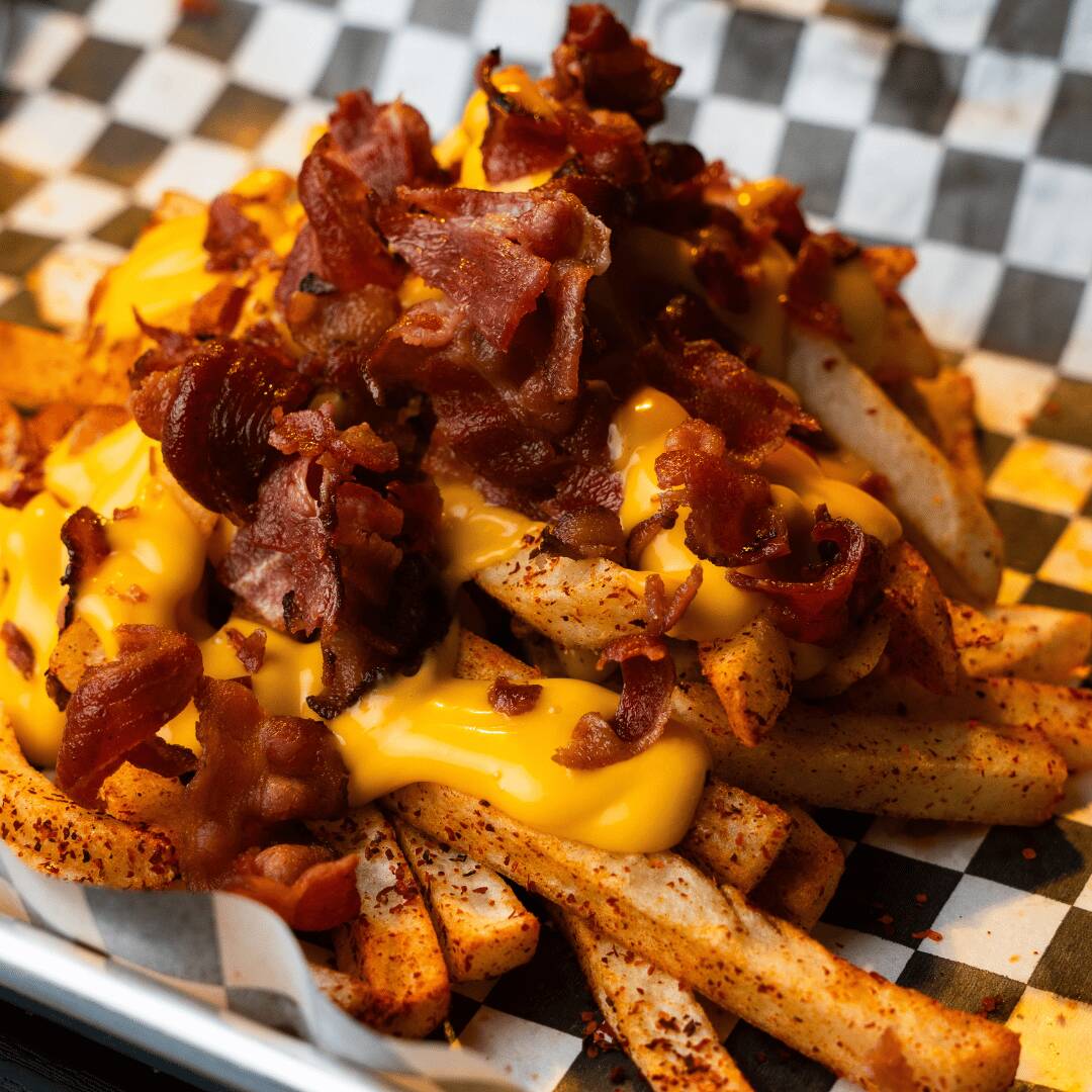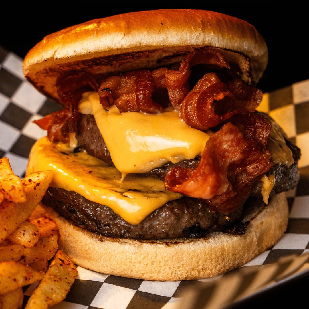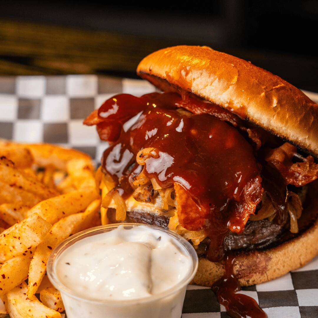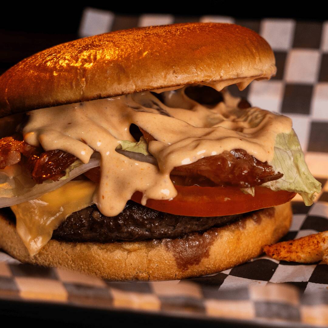Pan Brioche, Carne Sirloin, Queso, Tocino, Cebolla caramelizada y salsa BBQ + Papas estilo cajún