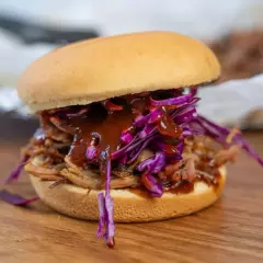 Delicioso pulled pork ahumado por 5 horas, con BBQ de la casa, en un pan brioche con una ensalada de col.