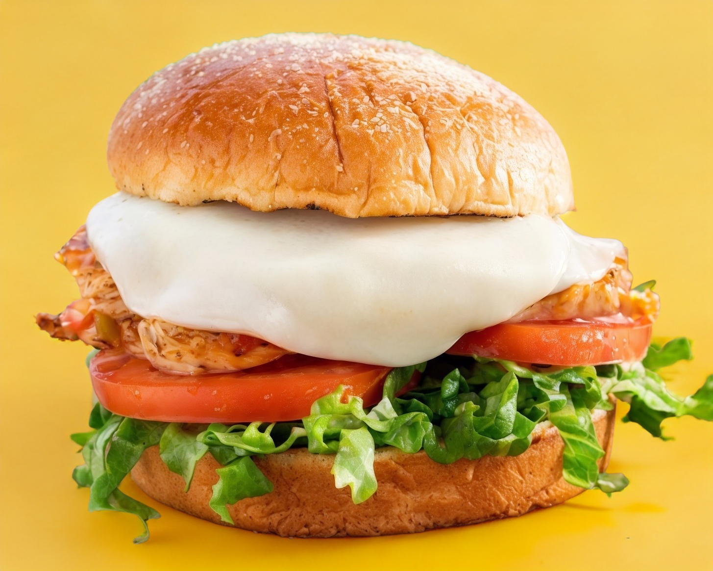 Pollo crujiente, Queso suizo, Lechuga, Tomate, aderezo buttermilk en pan brioche.