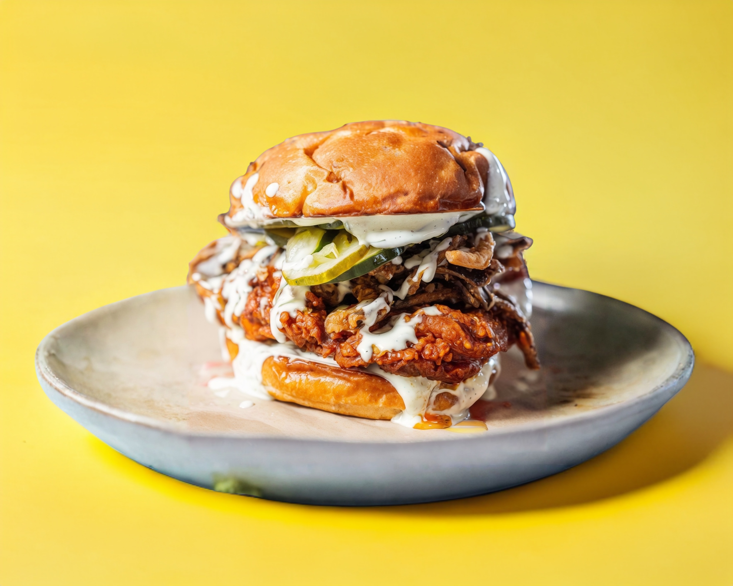 Pollo frito picosito, Pepinillos, Cebollas crujientes, aderezo buttermilk en pan brioche