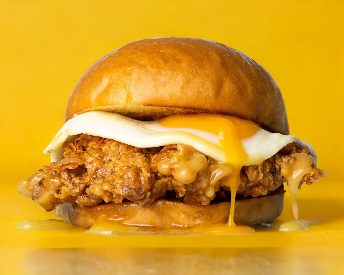 Huevo estrellado, Pollo frito, Miel-Mantequilla en pan brioche.