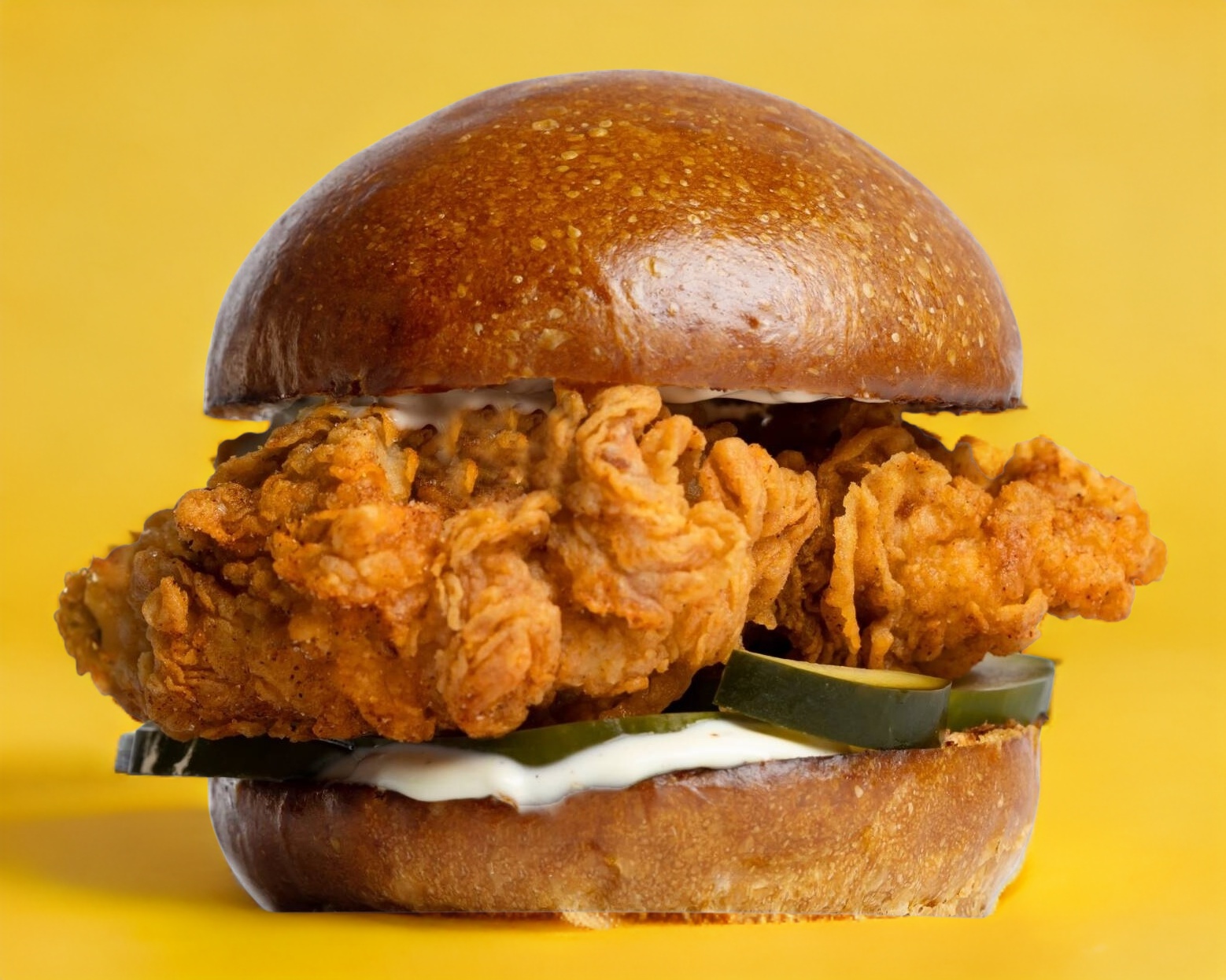 Pollo crujiente, Pepinillos, aderezo buttermilk en pan brioche.