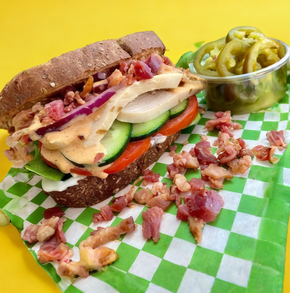 Pan integral con pechuga de pollo, aderezo chipotle, bacon bites, queso suizo, tomate, pepino, cebolla morada, lechuga romana y mayonesa.