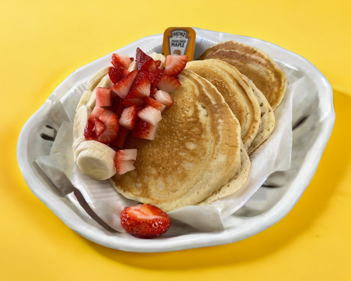 3pz de Pancakes de mantequilla, acompañados con plátano y fresas, miel de maple aparte.