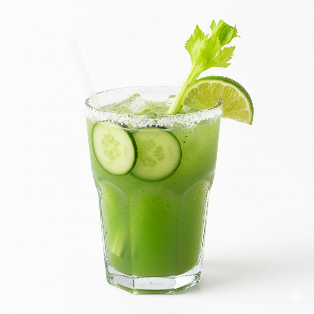 Pepino, apio, limón, agua y un toque de sal de mar. 16oz