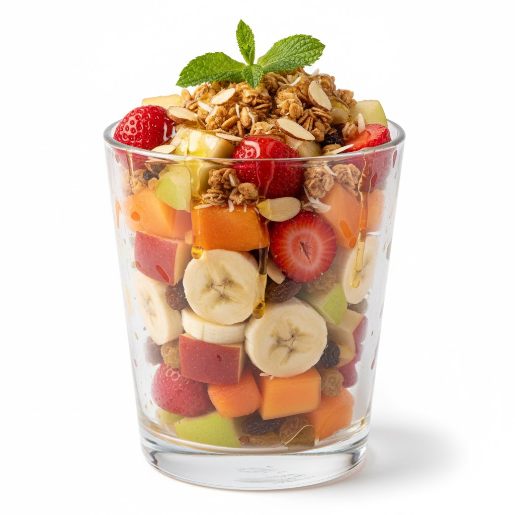 Vaso de 16oz con Manzana roja, plátano, pera, papaya, fresas, pasas, almendras ralladas, revuelto con granola y yogurt.
