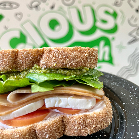 Pan integral con pesto y jamón de pechuga de pavo, queso panela, mayonesa, tomate y lechuga romana.