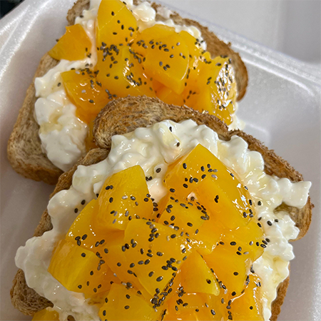 2 pz de Pan integral tostados con queso cottage, decorado con duraznos en almíbar, semillas de chía y un toque de miel de agave encima.
