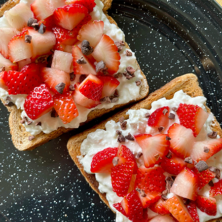 2 pz de Pan integral tostados con queso cottage, trozos de fresas y decorado con cacao nibs.