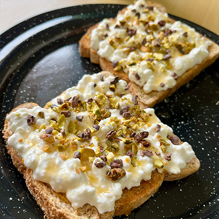 2 pz de Pan integral tostados con queso cottage, trozos de pistache, cacao nibs y miel de abeja.