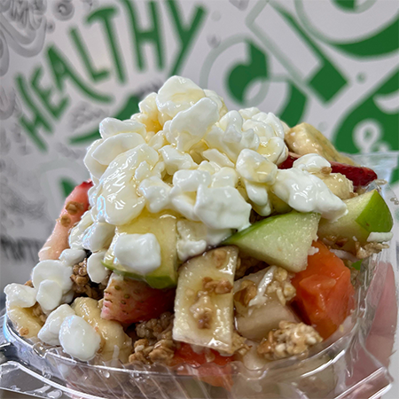 Vaso de 20oz con manzana roja, plátano, pera, papaya, fresas, pasas, almendra rallada, coco rallado y revuelto con miel de agave.