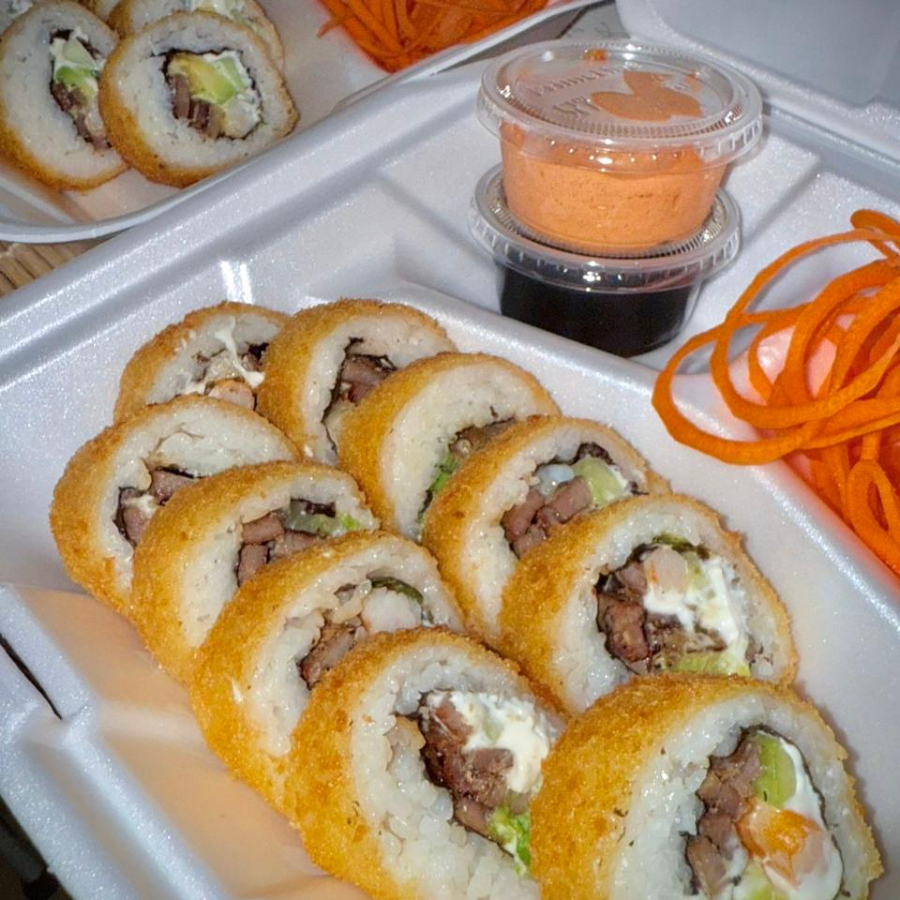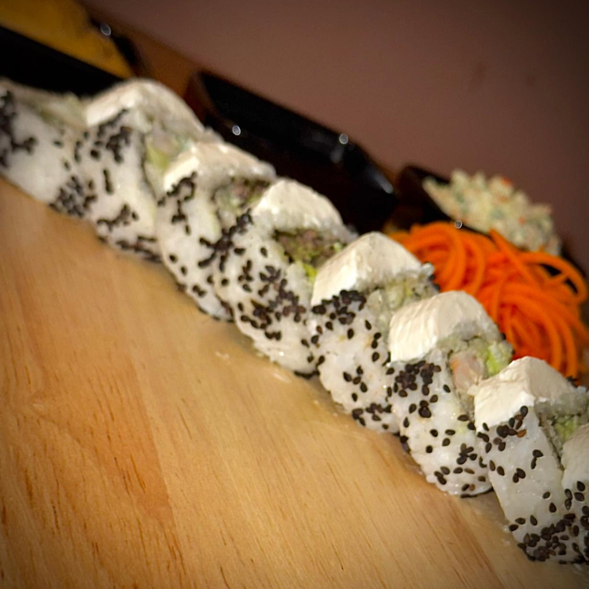 Rollo empanizado, con alga,pollo y carne asada al carbón, camarón cocido,aguacate, pepino y Queso Philadelphia.