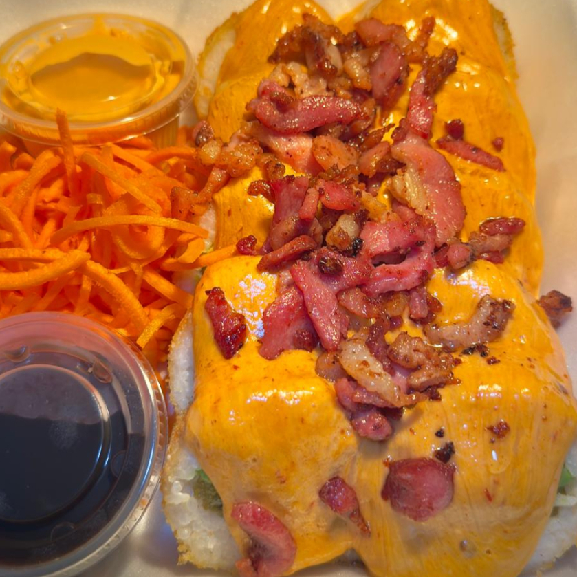 Rollo empanizado, sin alga, carne y pollo asados al carbón, chile california tatemado, aguacate, pepino y queso Philadelphia, gratinado con queso Spicy Monterrey Jack y tocino.