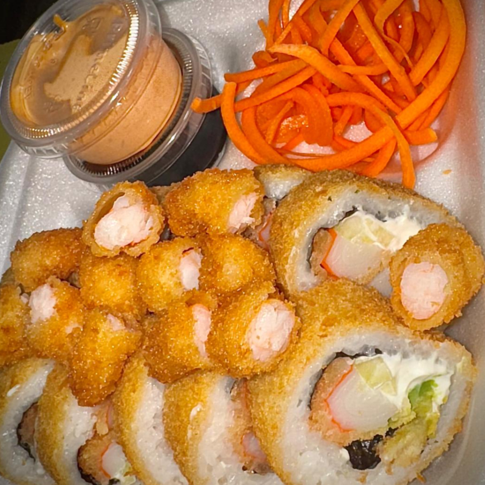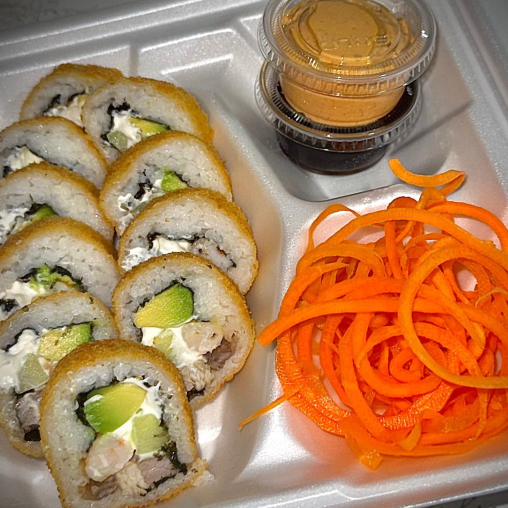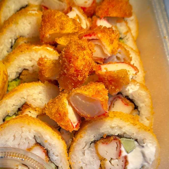 Rollo empanizado, con alga, aguacate, pepino, queso Philadelphia, surimi empanizado por dentro y por fuera.
