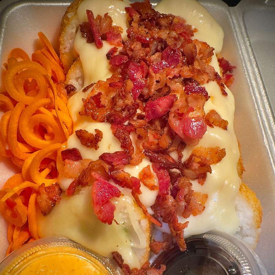 Rollo empanizado, sin alga, carne asada al carbón, chile california asado, aguacate, pepino y Queso Philadelphia, gratinado con queso Monterrey Jack y tocino.