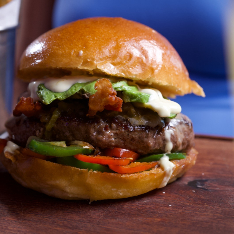 180gr. Carne de tu elección, chicharón de res (20gr), salsa bandera, guacamole, chile verde, queso Mty Jack y aderezo Mayo-Cilantro.