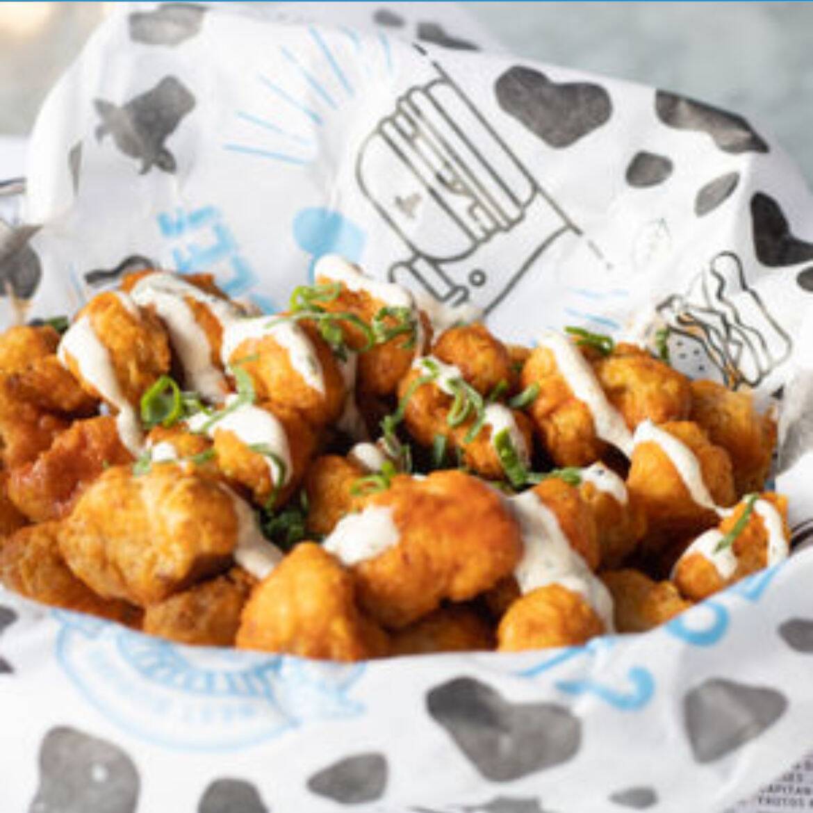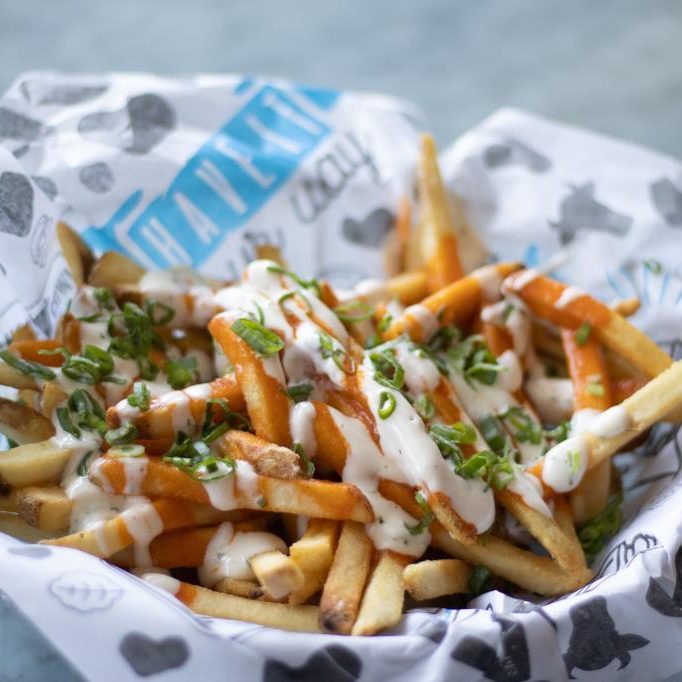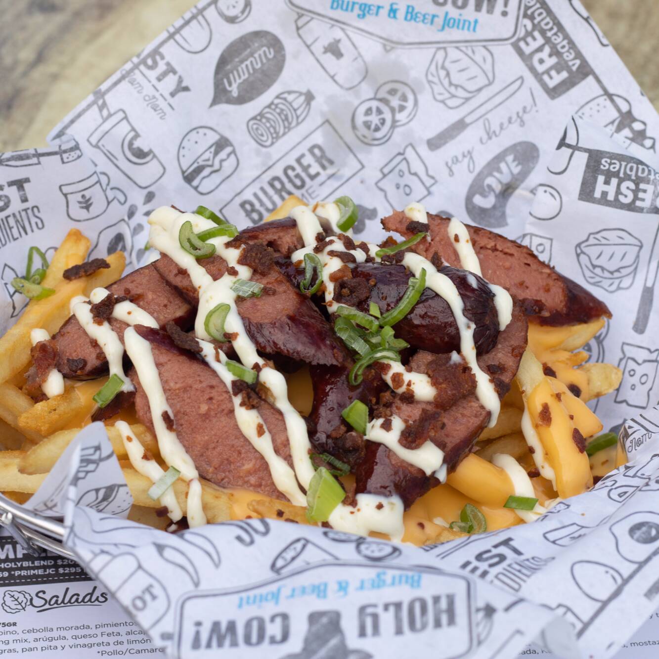 350gr. Papas fritas bañadas en Cheddar cheese sauce, cebolla caramelizada y aderezo Holy Cow!
