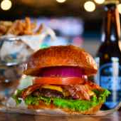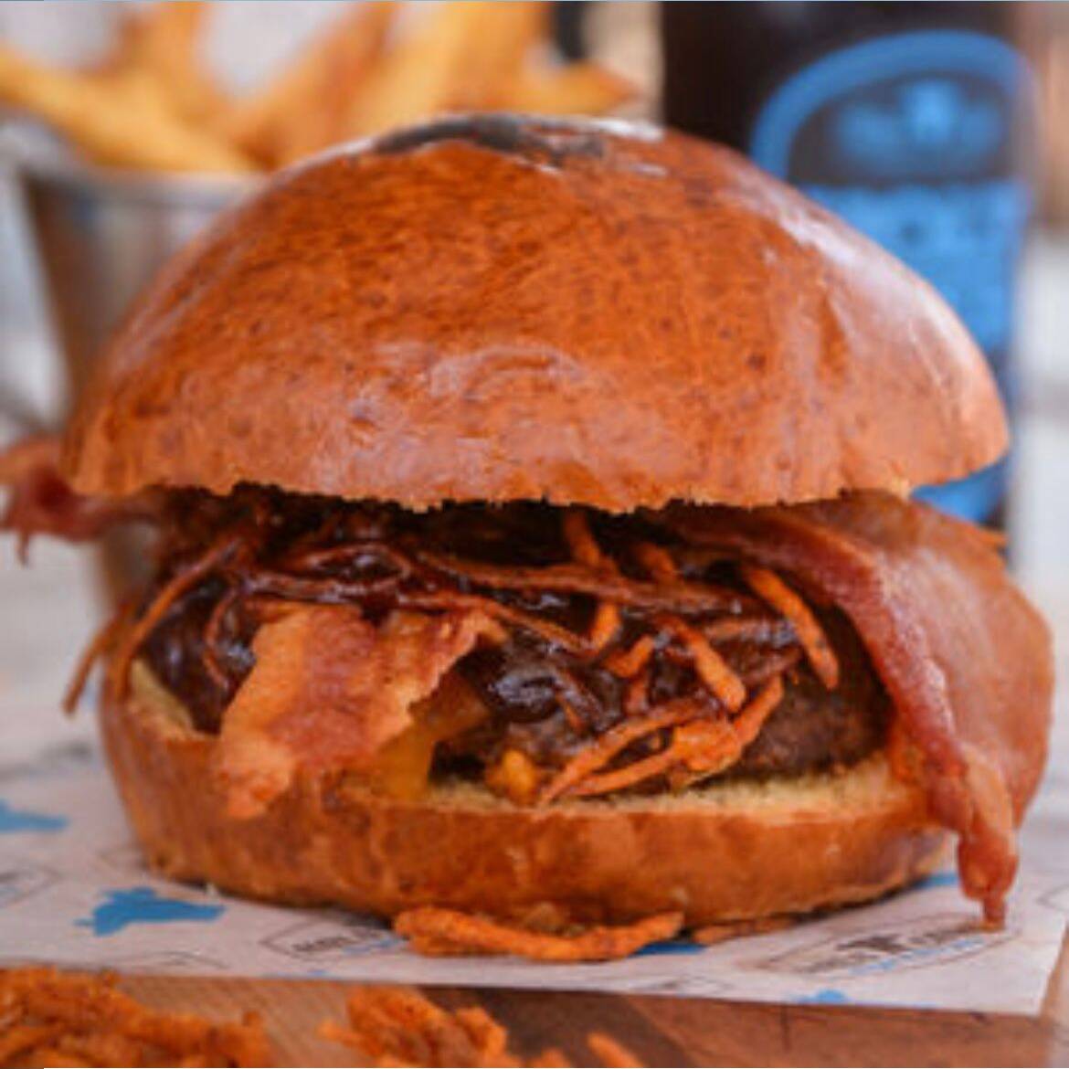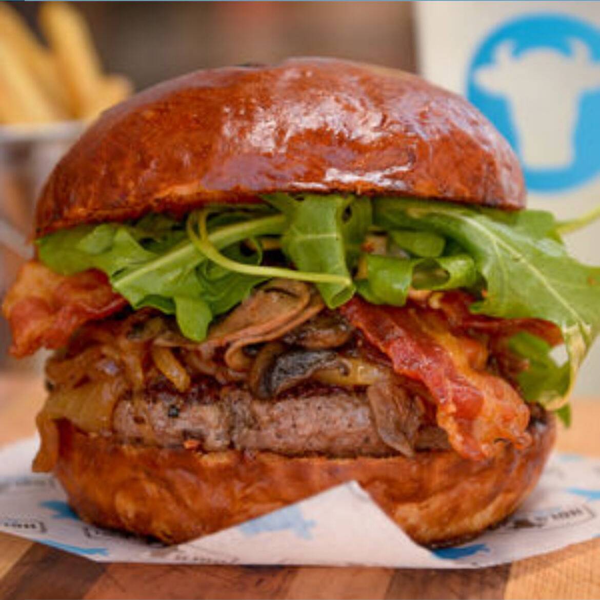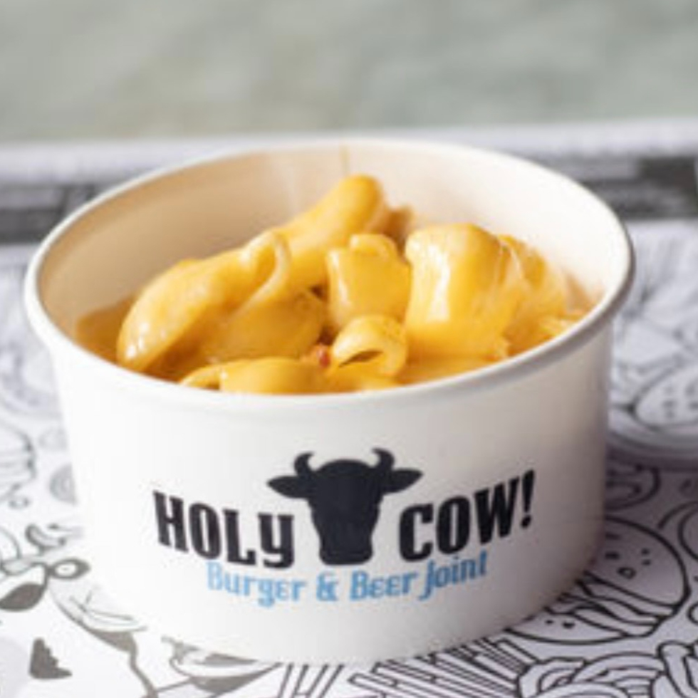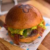 180gr. Carne de tu elección, tocino, lechuga chiffonade, tomate, queso americano, cebolla caramelizada y aderezo Holy Cow!