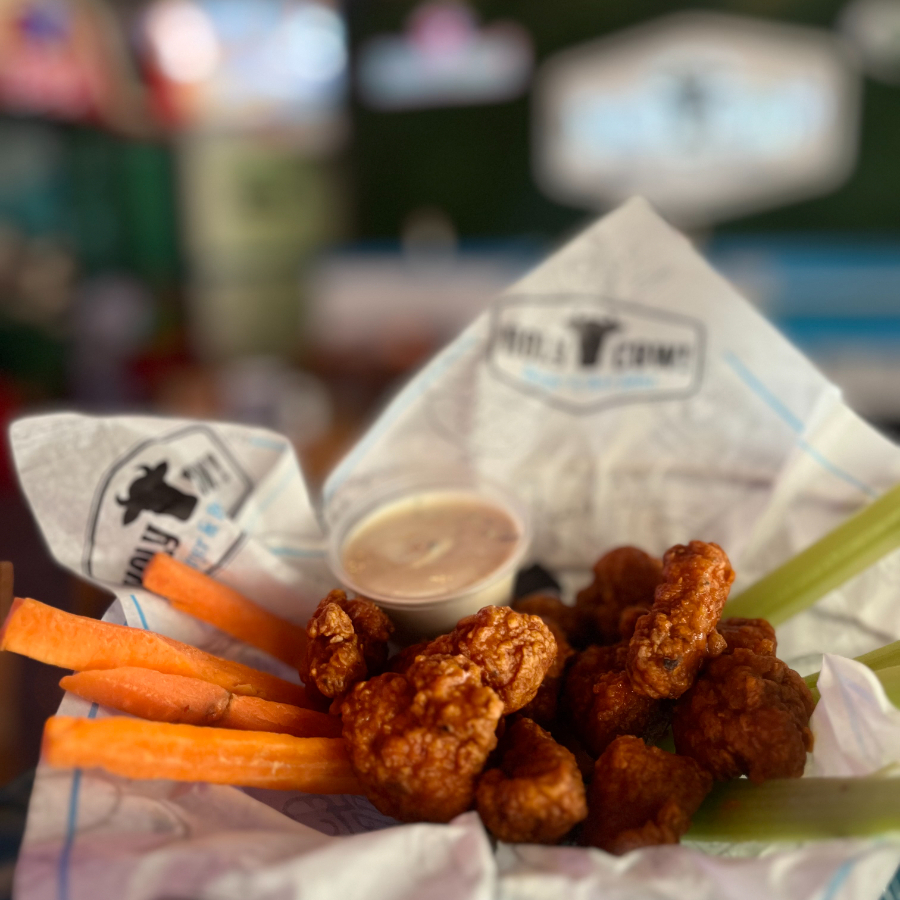 Boneless en salsa buffalo, lechuga sucrine, champiñón, tomate, zanahoria y cebolla morada fileteada, pimiento, fritura de tortilla y aderezo Ranch.