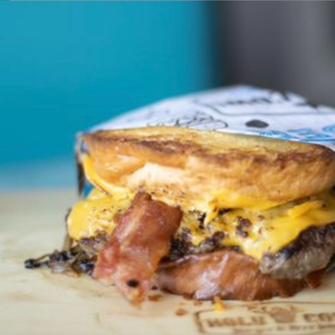 180gr. Doble carne de tu elección, cebolla cruda picada, pickle rebanado, queso americano, tocino y aderezo Holy Cow!