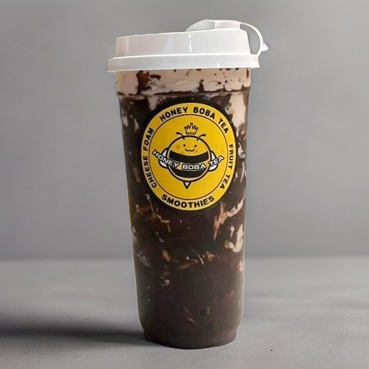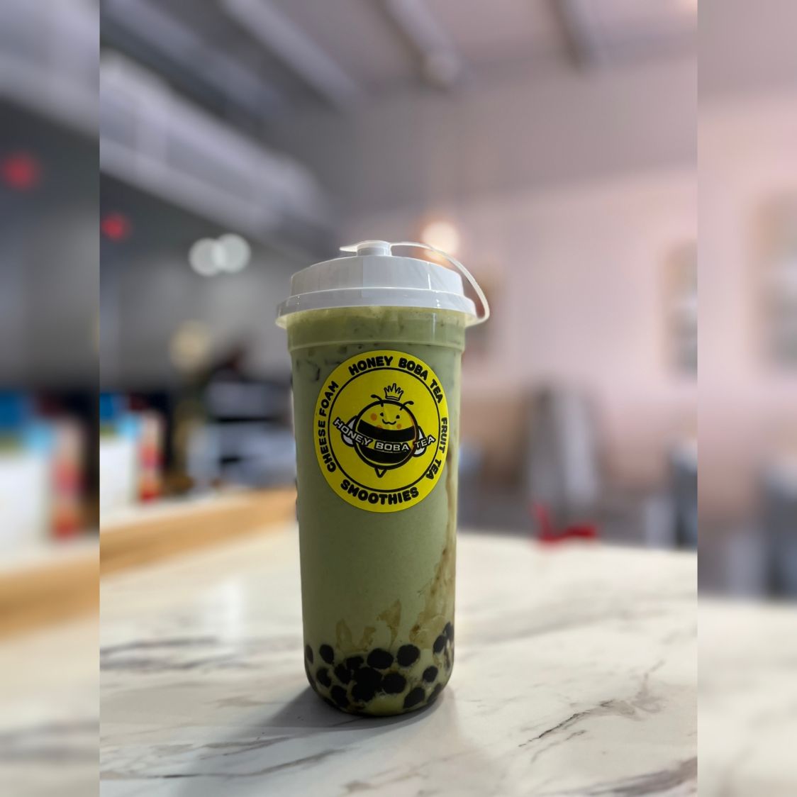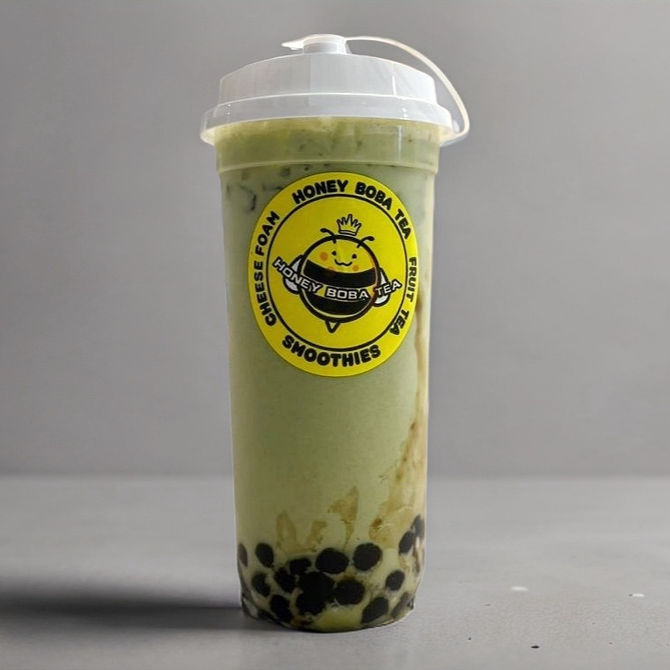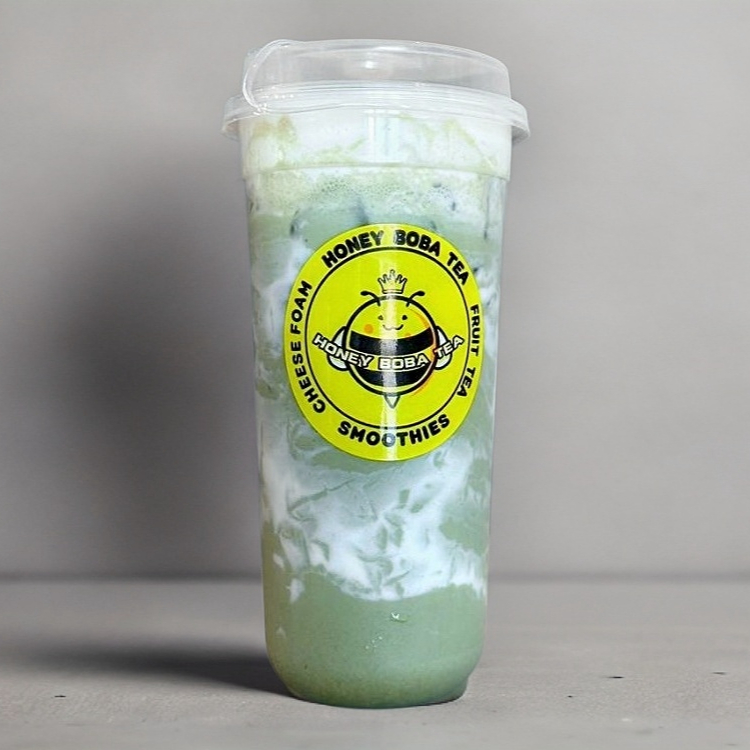 Té matcha en las rocas con una capa de cheese foam y decorado con este mismo. No incluye boba.