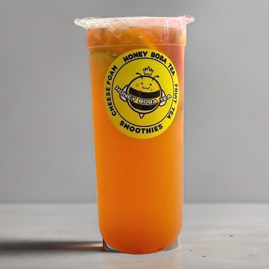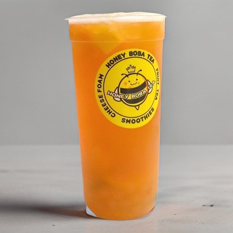 Bebida de té de jazmín con frutas como durazno, naranja y limón.