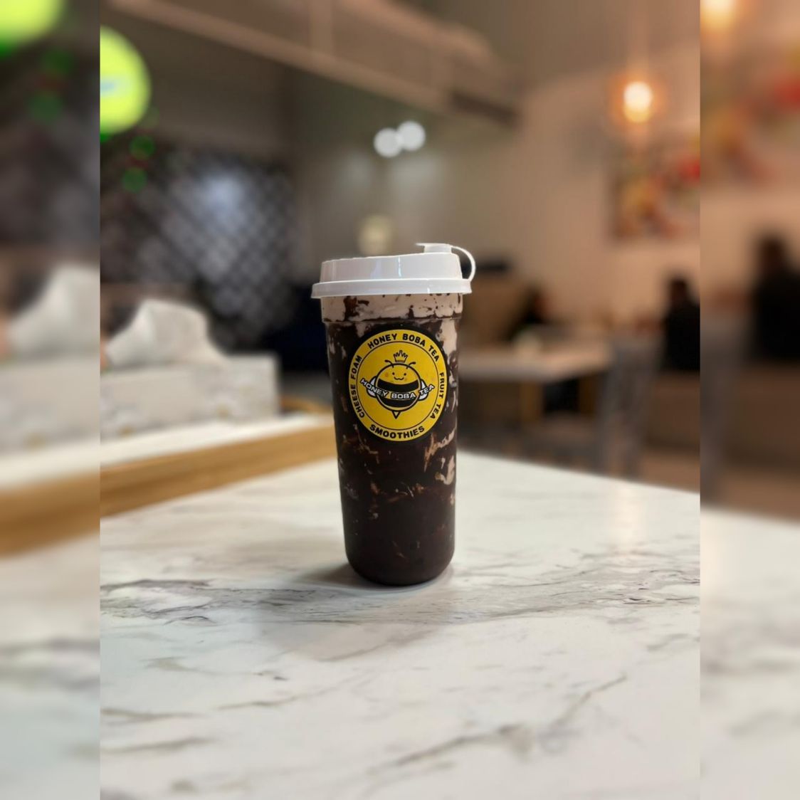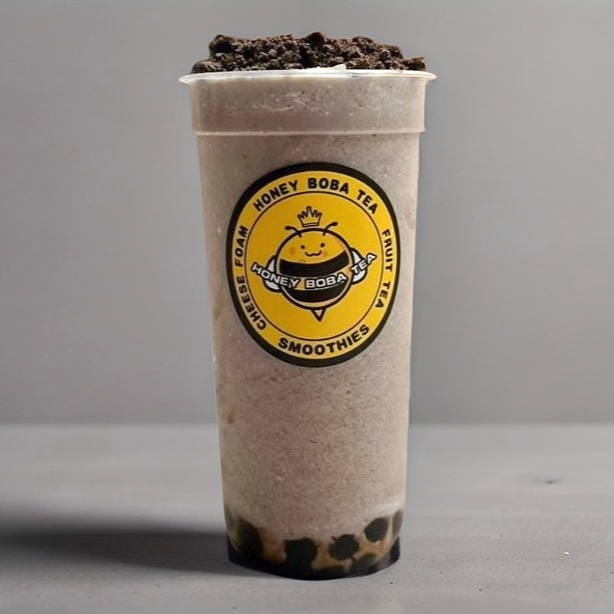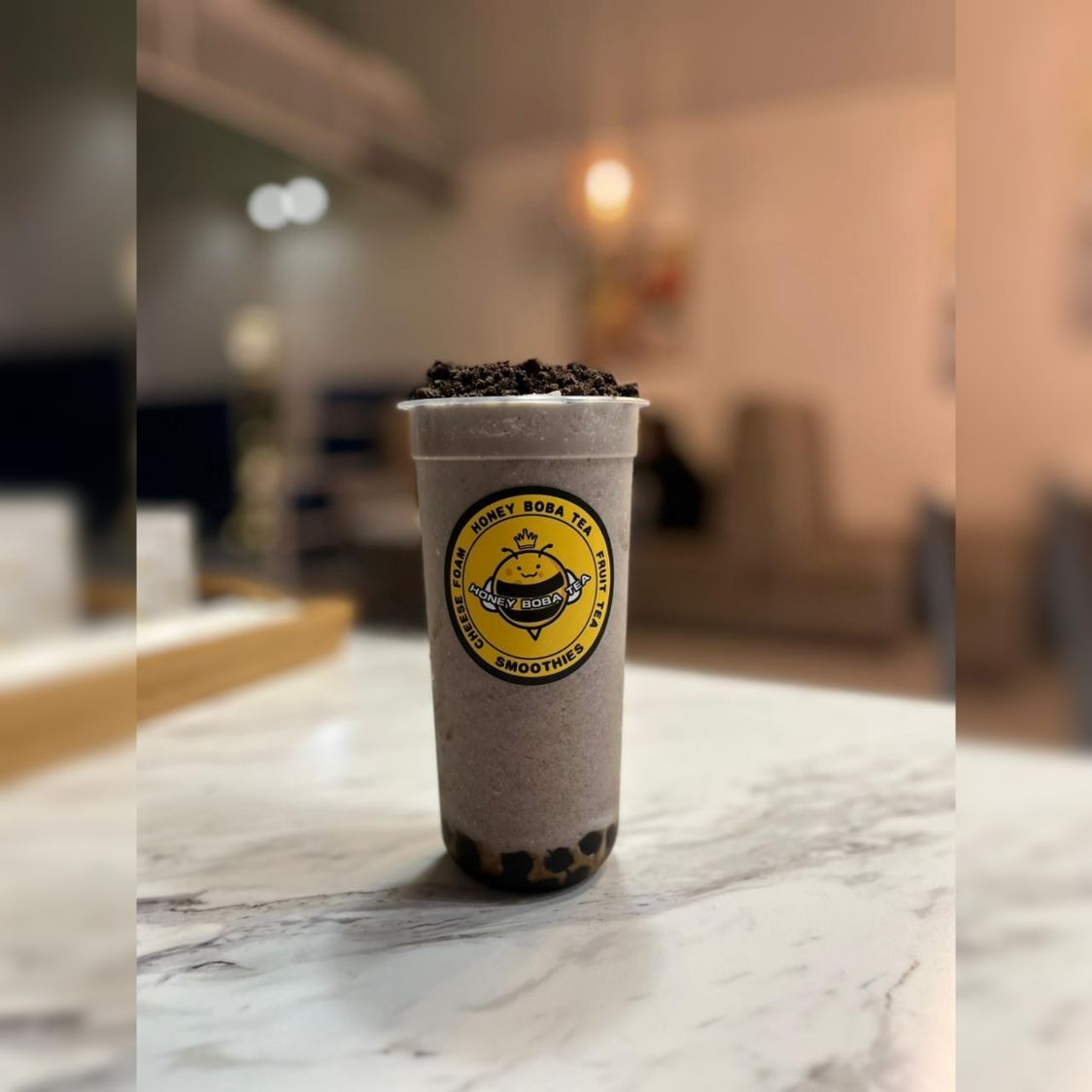 Smoothie de oreo y vainilla a base de leche, endulzante decorado con boba y polvo de oreo