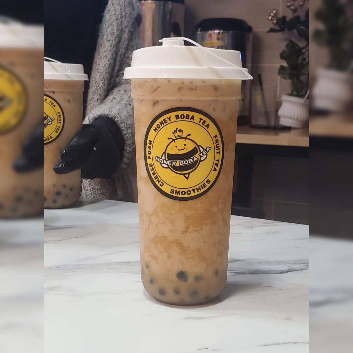 Milk tea en las rocas endulzado con jarabe de azúcar mascabada, decorado con boba