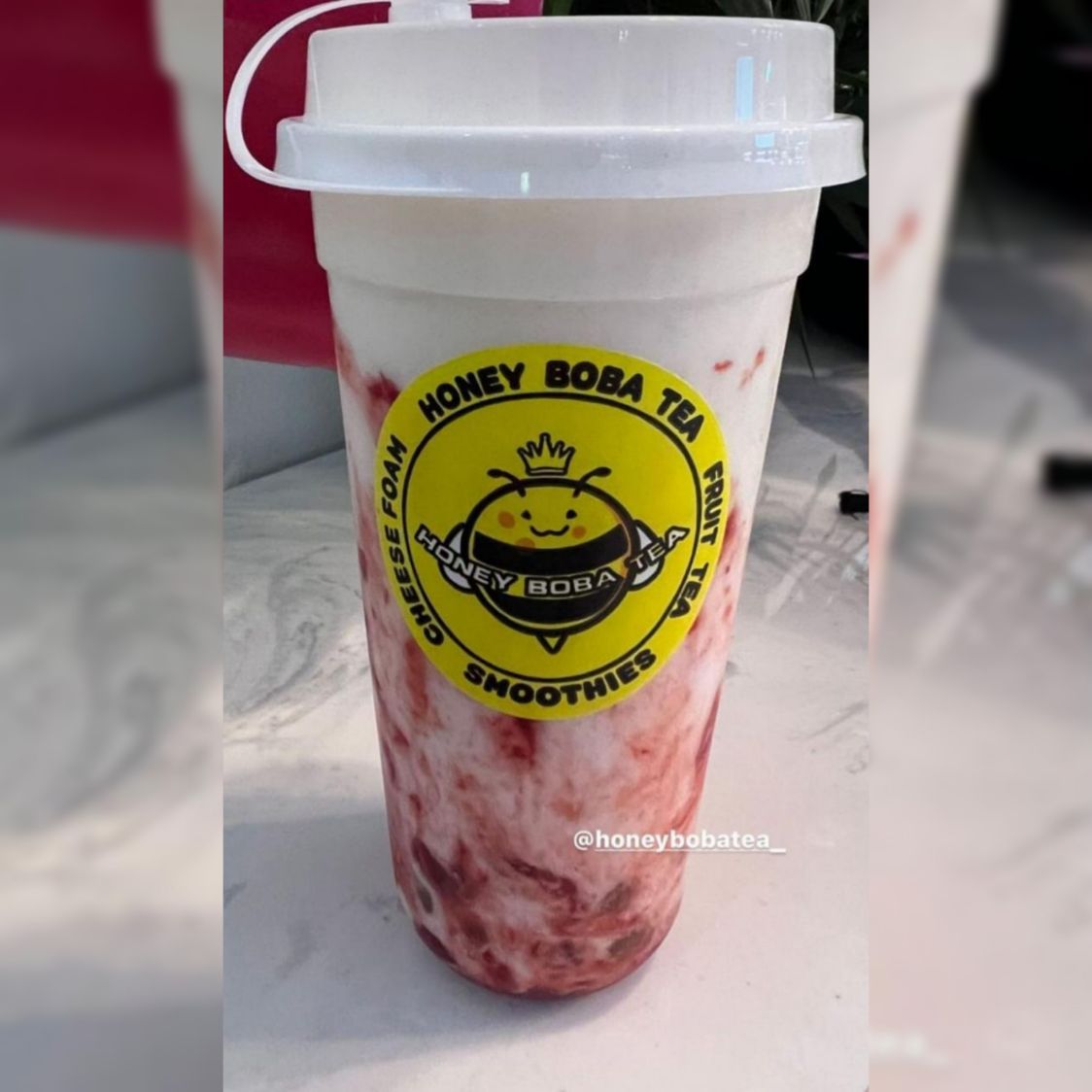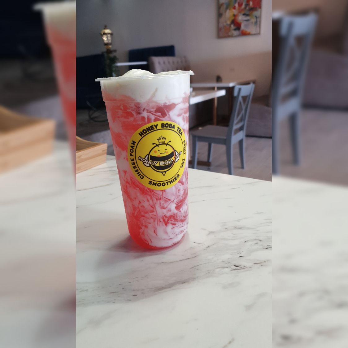 Smoothie de fresa a base de leche acompañado de cheese foam. No incluye boba.