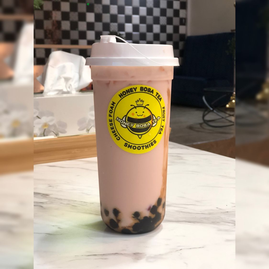 Té negro con boba en la rocas, crema deslactosada, endulzado con jarabe de rosas.