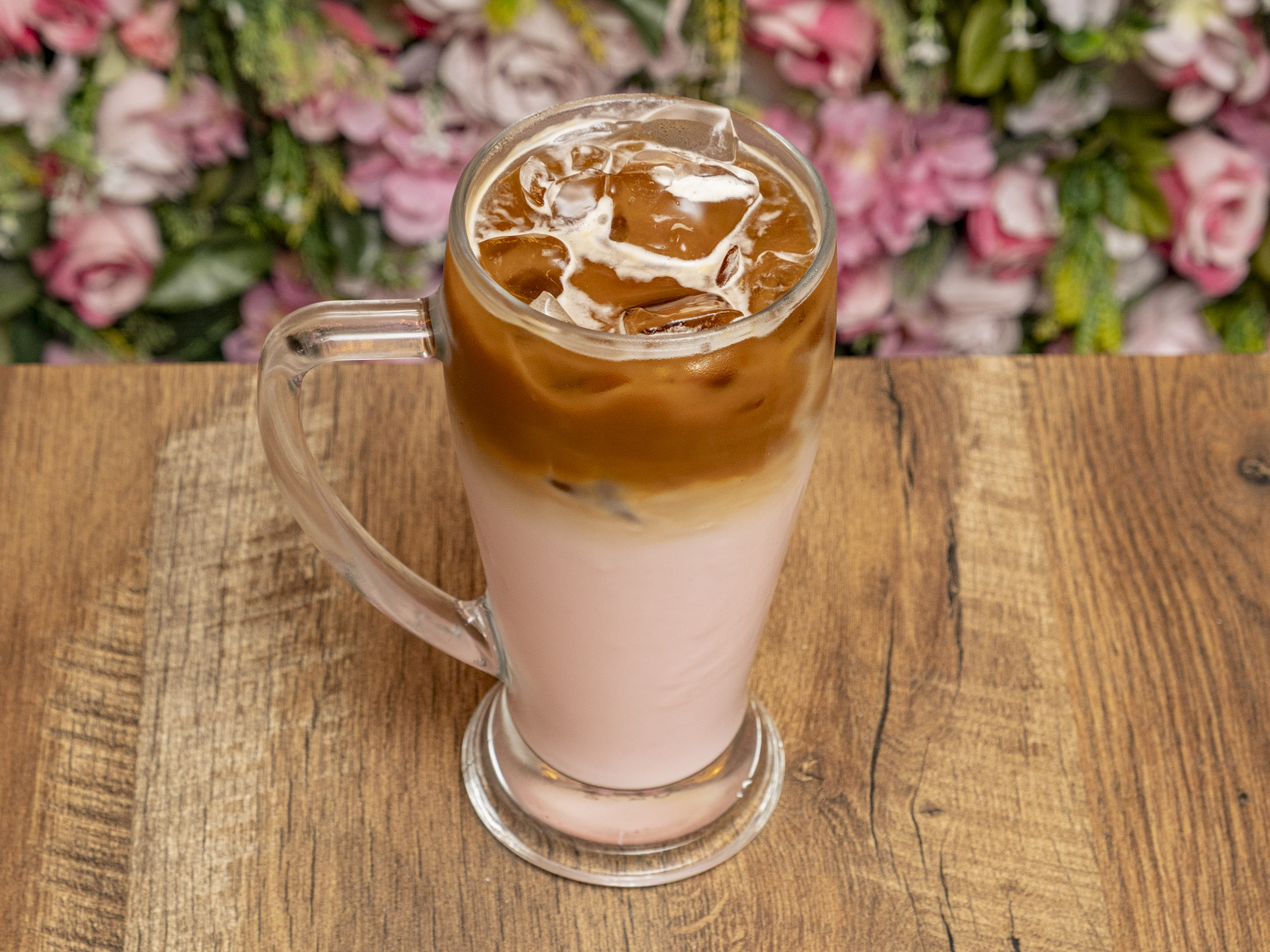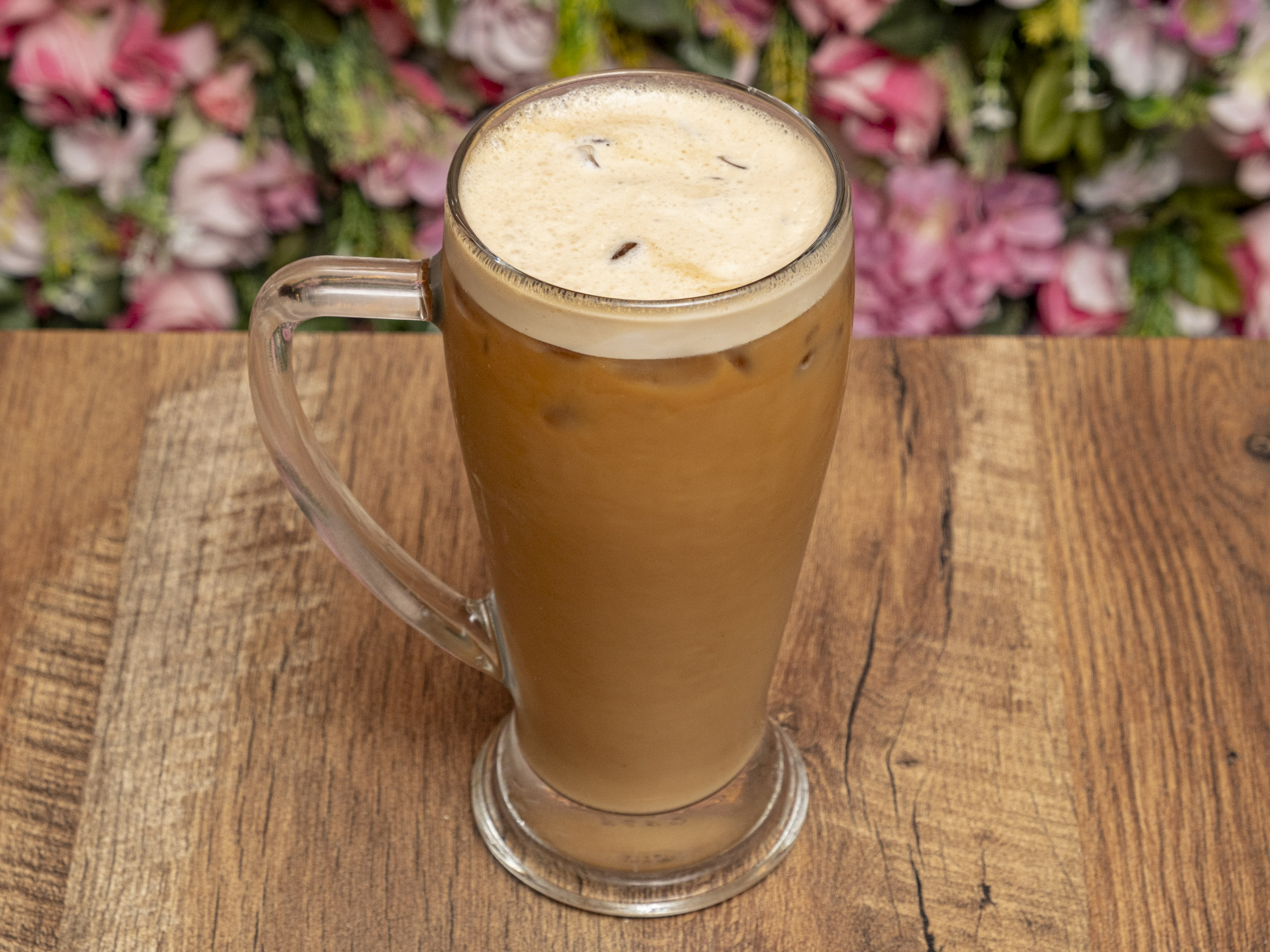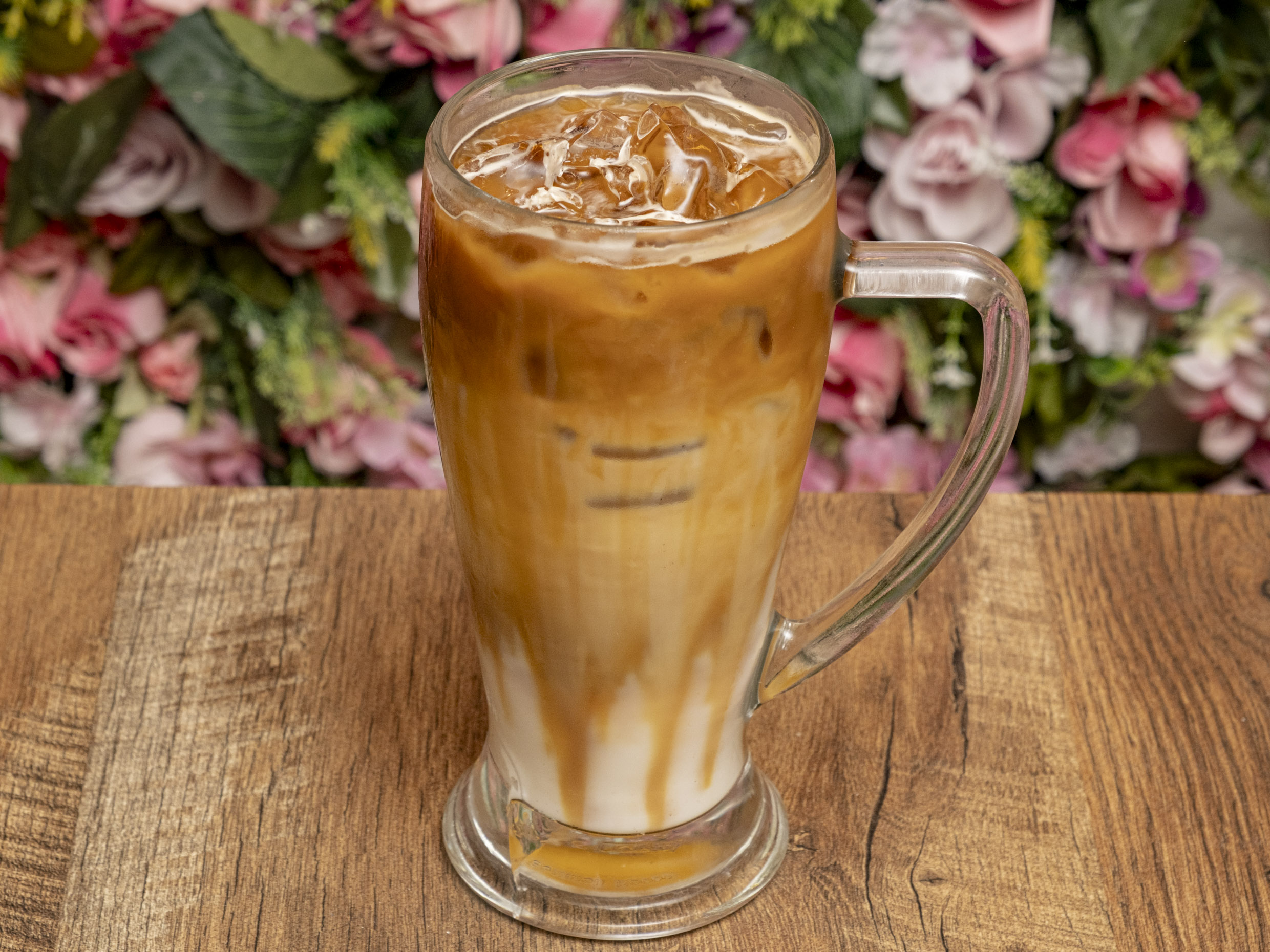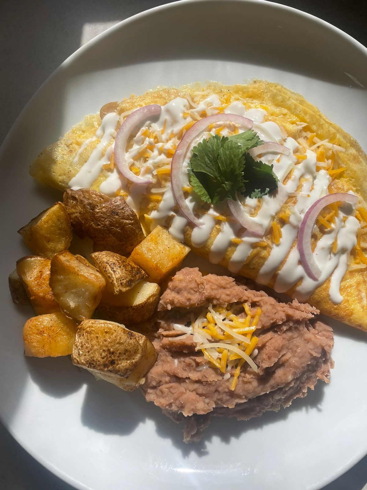 Tocino y jamón, bañado en crema de tres quesos, cilantro y aguacate, acompañado de papas y frijoles.