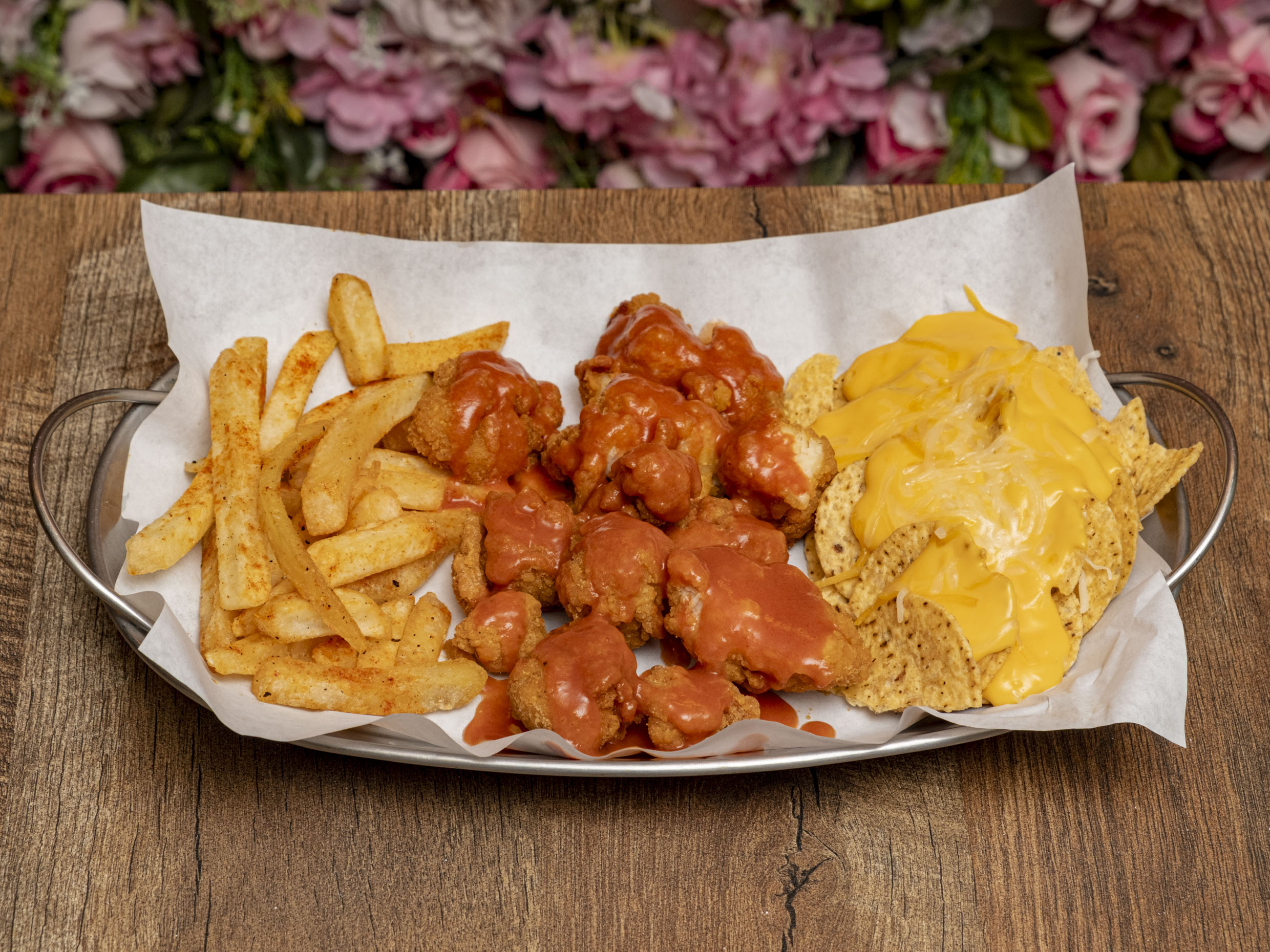 Salsa buffalo o BBQ acompañados de papas sazonadas y nachos.