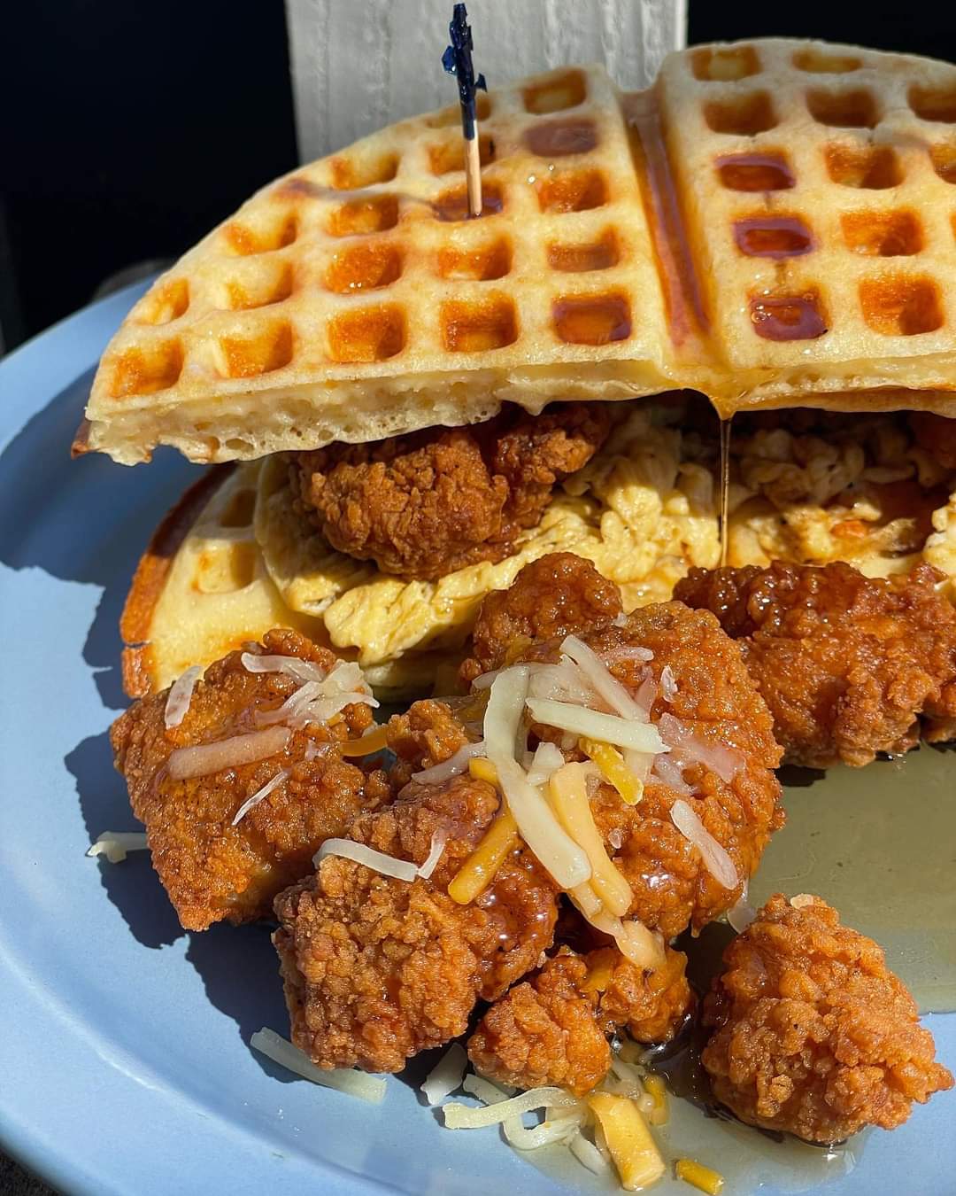 Waffles con pollo frito, queso, huevo y miel de maple.