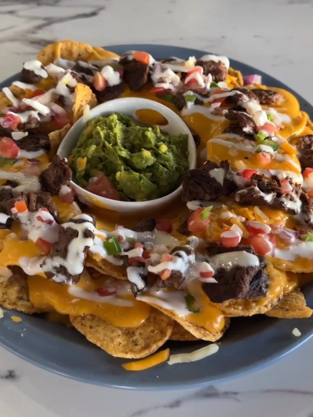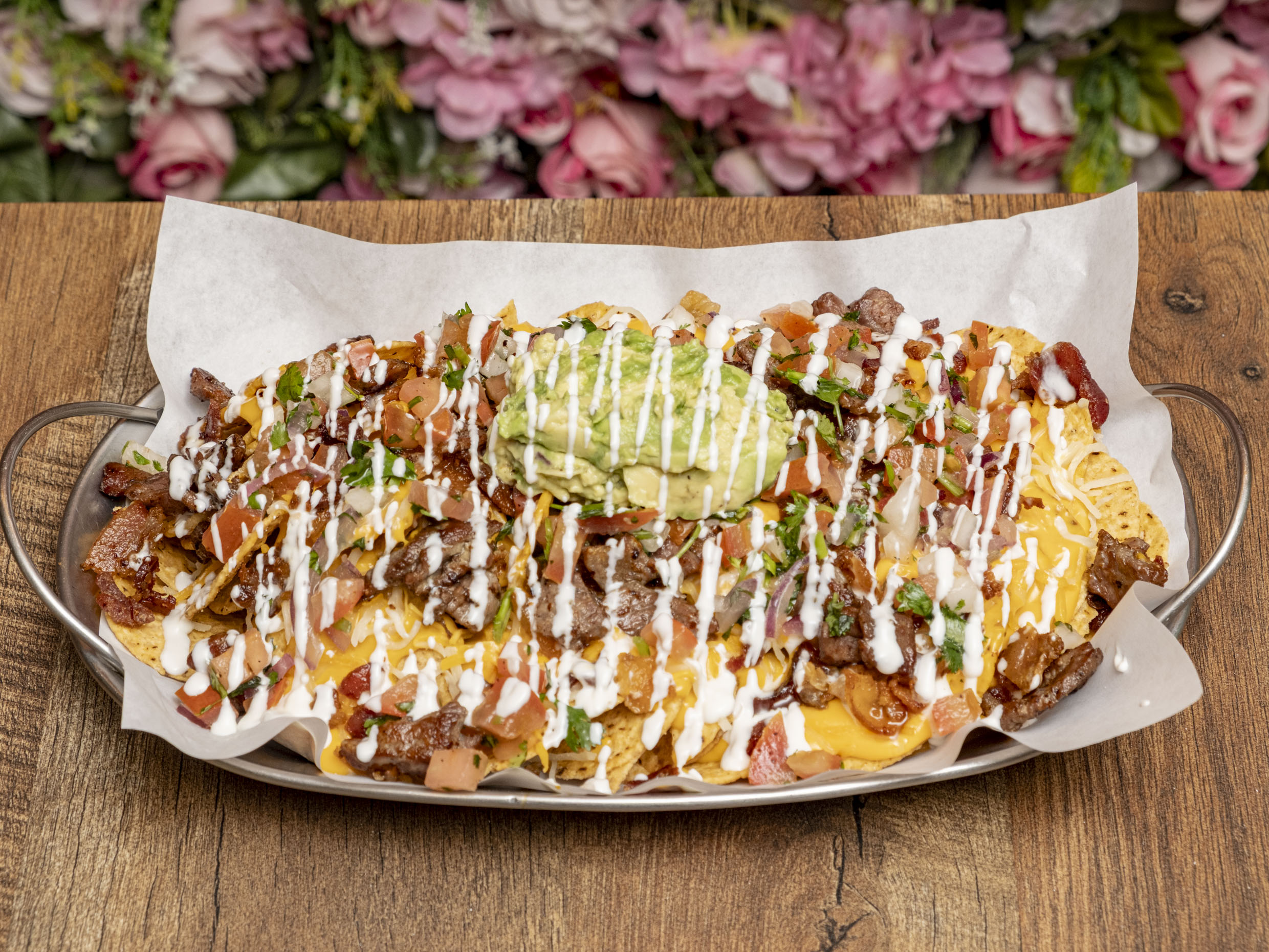 Carne, queso rallado, guarnición de guacamole, crema agria y pico de gallo.
